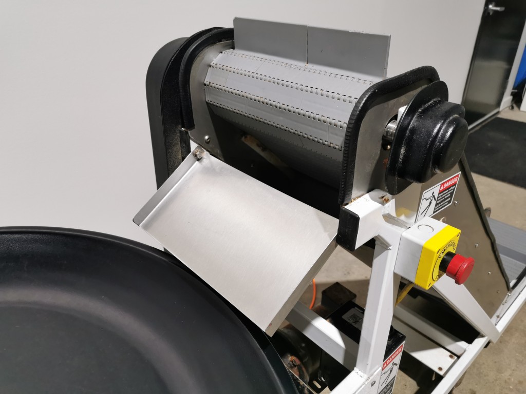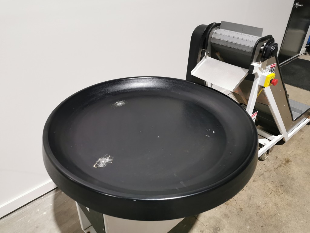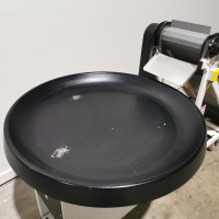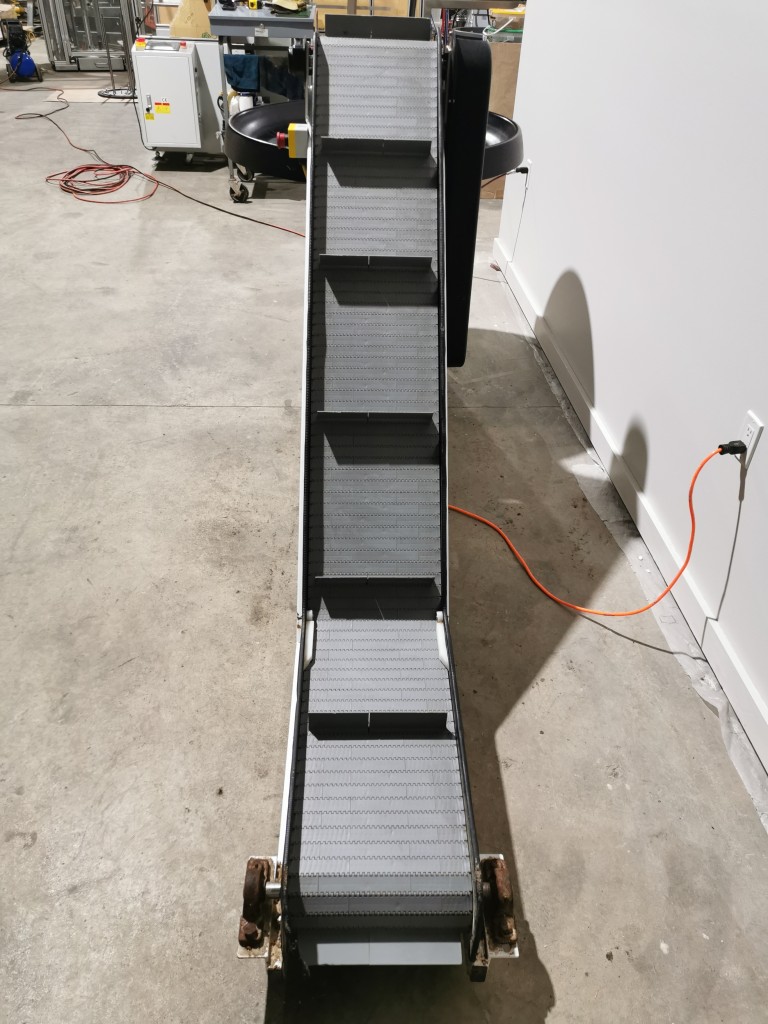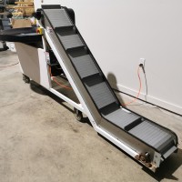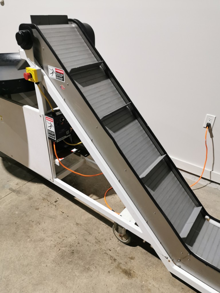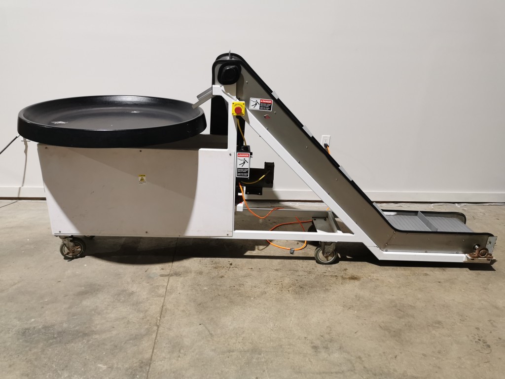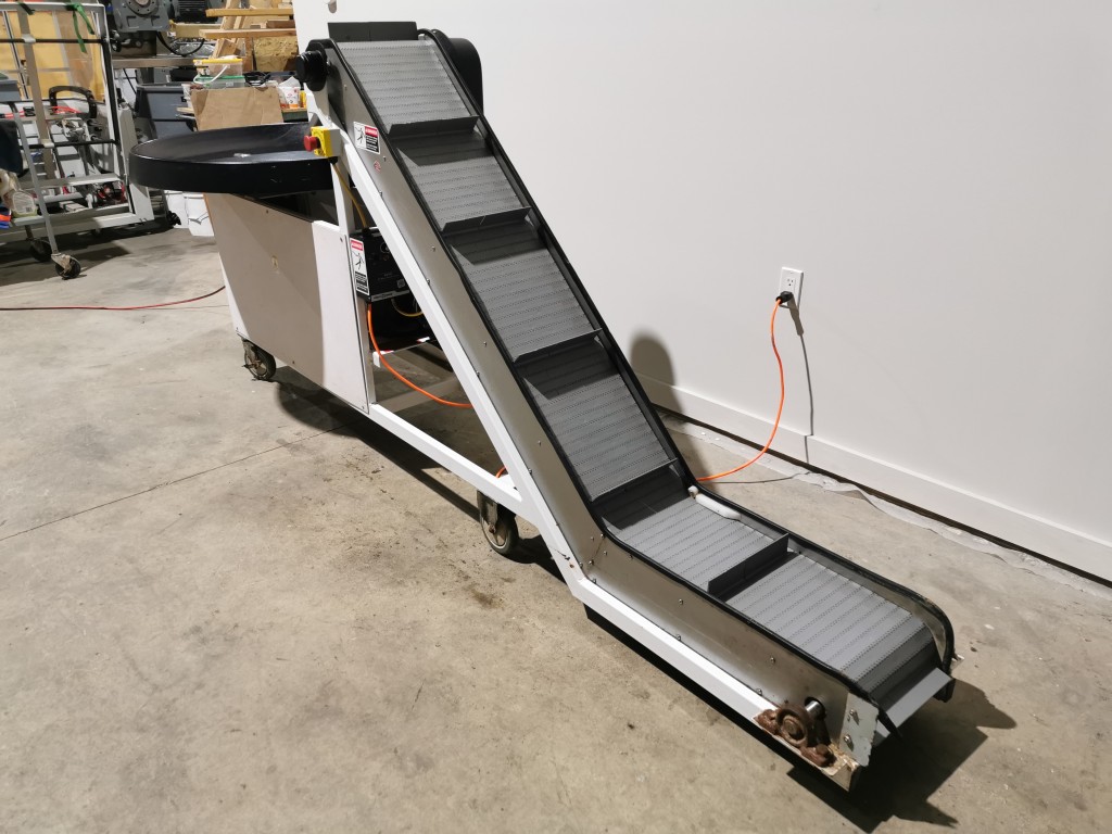 Inquire About This ProductItem #: 6085Incline take away conveyor with turntable. The conveyor belt is made by Intralox and is 12" wide and has 2" high cleats that are 15" apart. The side walls of the conveyor are 1.25" tall. It has a dished 38" diameter turntable that's 37.5" from the floor. Variable speed controler. The casters need replacing. Last used in a food facility. In good working condition.