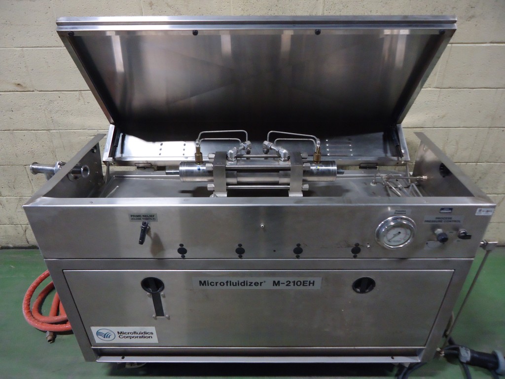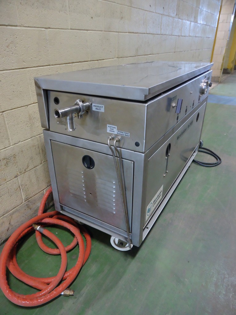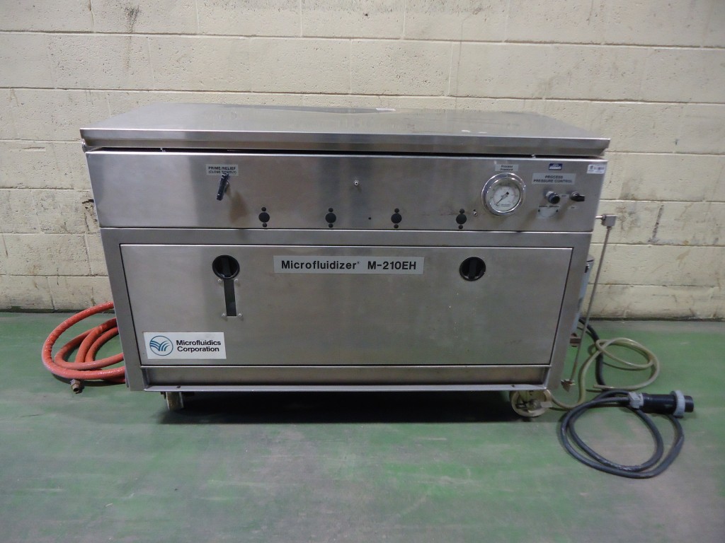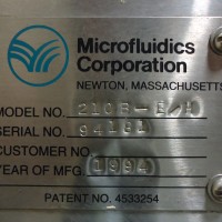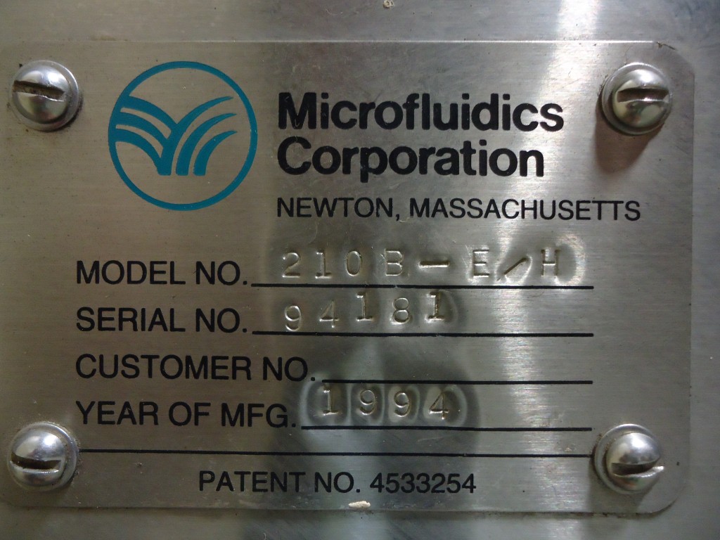 This microfluidizer is all stainless steel. The heat exchanger is 500 psi shell, 150 psi tubes, 250°F temperature. It has a hydraulic fluid pump and reservoir, pressure control and gauge, prime / relief valve. Unit is on casters. Last used in a pharmaceutical facility. Specifications: Operating Pressure: 4,000 to 18,000 PSI, (270 to 1200 bar). Nominal flow rate: 0.5 to 0.6 GPM, (1.9 to 2.3 LPM). Sample size: 1 gallon to continuous.
