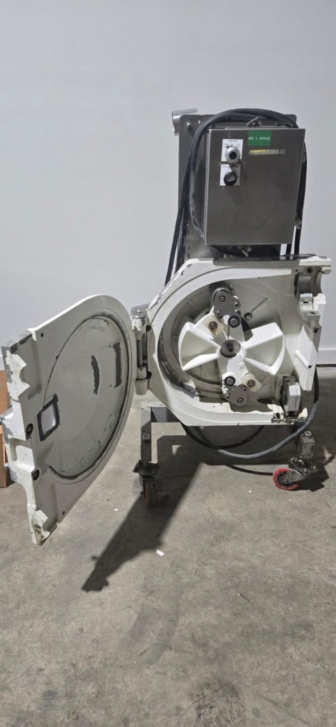 Pump comes on it's own stainless steel cart on casters. 2.5" outside diameter sani clamp connection inlet and outlet. Variable speed. In good condition. Paint is flaking off the outside of the pump housing. Last used in a food facility. Comes with a 840 2 bar bioprene element. 40 mm bore 1250 mm long.
