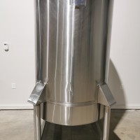 All stainless steel tank with mild steel feet. The tank is 23.75" diameter x 36.5" straight wall with a 3.5" deep dish bottom (approximately 70 gallons). It has a mounting bracket for a mixer. The outlet is a threaded 2.75" outlet with an elbow. Attached to the elbow is a 3.5" outside diameter sani clamp butterfly valve. The tank outlet is 26" from the floor with and 17.5" with the elbow and valve connected. In good condition. Last used in a food facility.