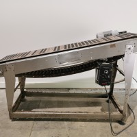 This 90 degree conveyor is 6' long at the infeed and 12' long from the 90 to the end. The conveyor is currently on an incline and goes from 16" to a discharge height of approximately 28". The belt is a 7.5" wide table top chain. The conveyor channel is stainless steel with a single guide rail running the length. In good condition.