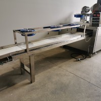Stainless steel conveyor with Interlox belt. The belt is 6" wide x 115" long with guide rails. variable speed controls. It has stainless steel legs with height adjustable feet. Currently it is 35.25" from the floor. In good working condition. Last used in a food facility.