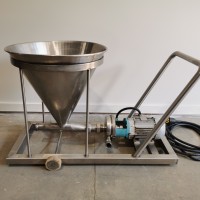 The hopper for this pump is 24" diameter x 22.5" deep. The pump has a 2.5" threaded inlet and a 2" outside diameter sani clamp connection outlet. It has 1.5" deep impellers. The pump is on a cart that has wheels on one end a a foot on the other. The hopper is removable from the cart if you want to run directly to the pump. In good condition. Last used in a food facility.