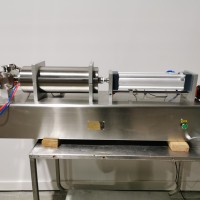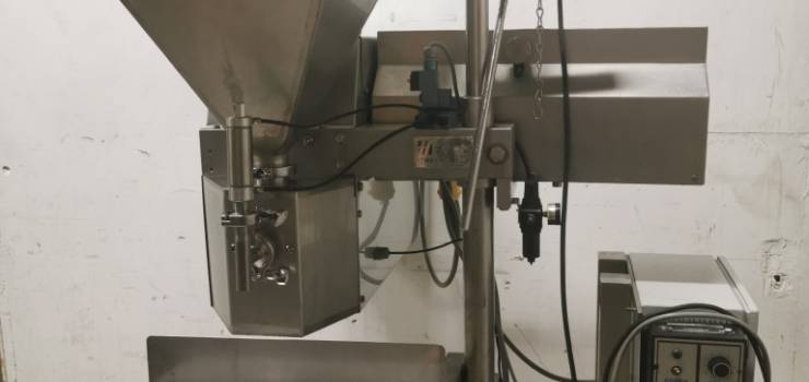 Single head table top piston filler. It has a fill range of 500 to 5000 ml. Hand crank adjustable stroke with reed switches mounted on the cylinder. It has a 3/4" shut of nozzle. It can run in automatic mode or actuated manually by foot switch. There is no hopper. In good working condition. Last used in cosmetic facility.