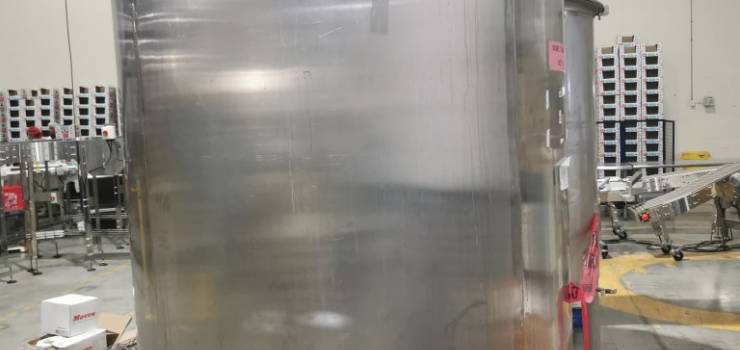 All stainless steel tank with mild steel feet. The tank is 23.75" diameter x 36.5" straight wall with a 3.5" deep dish bottom (approximately 70 gallons). It has a mounting bracket for a mixer. The outlet is a threaded 2.75" outlet with an elbow. Attached to the elbow is a 3.5" outside diameter sani clamp butterfly valve. The tank outlet is 26" from the floor with and 17.5" with the elbow and valve connected. In good condition. Last used in a food facility.