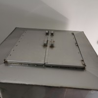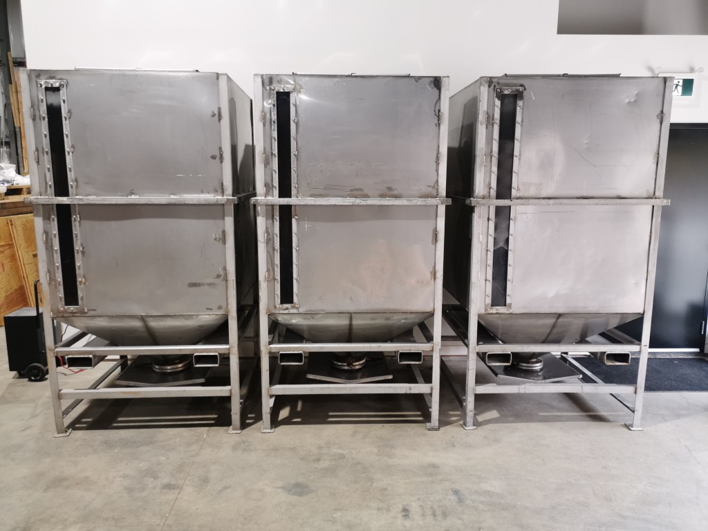 Inquire About This ProductItem #: 61223 identical hoppers. All stainless steel with a sight window down one side. Each has a 29.75" x 29.75" opening in the top with 2 hinged stainless doors. The hopper is 47.5" wide x 47.5" long x 80.5" deep to the centre discharge. They have a 60" side wall with a 20.5" deep 4 sided slanted bottom. The outlet is 7.5" diameter. Each has a vabric iris valve on the discharge. 95" tall overall. They have fortlift pockets for easy moving. Last used in a food facility.