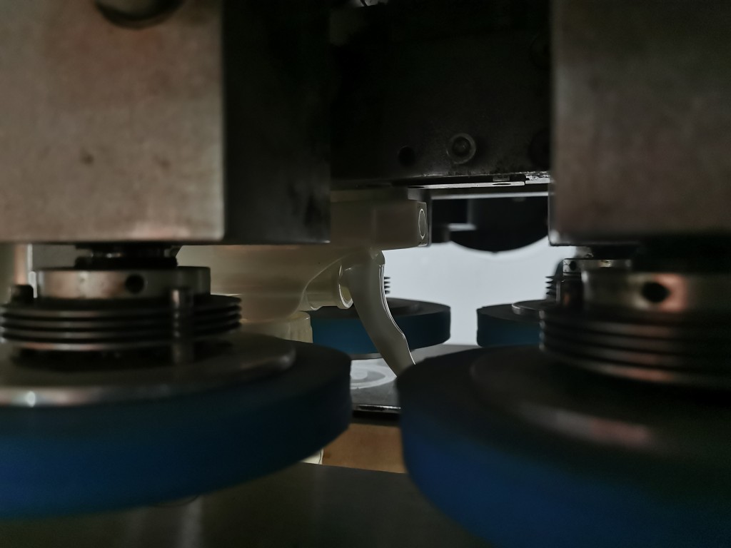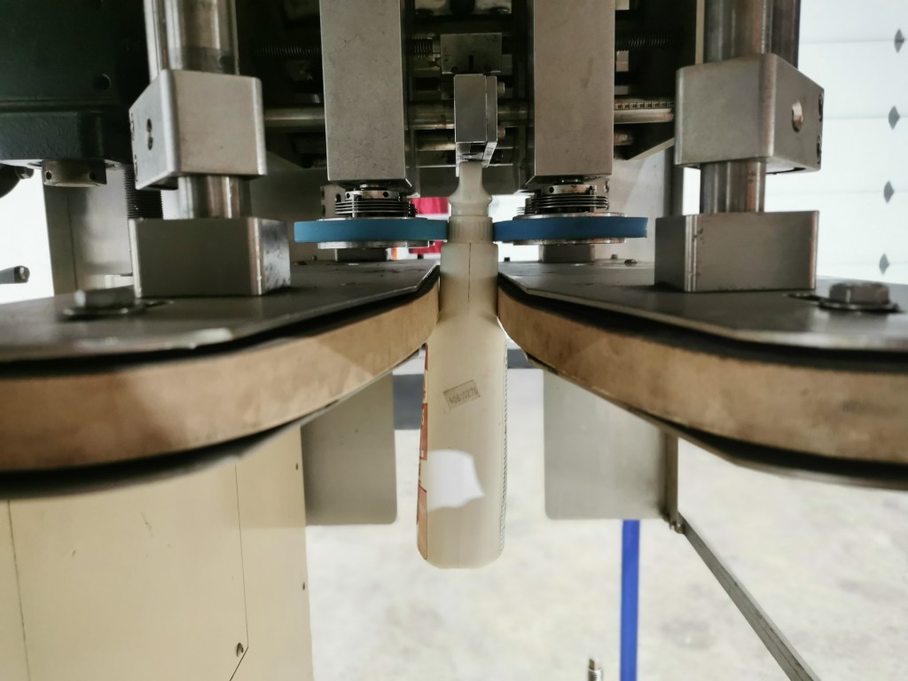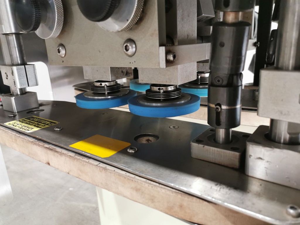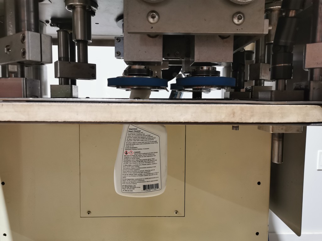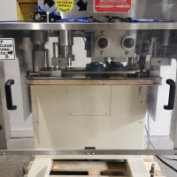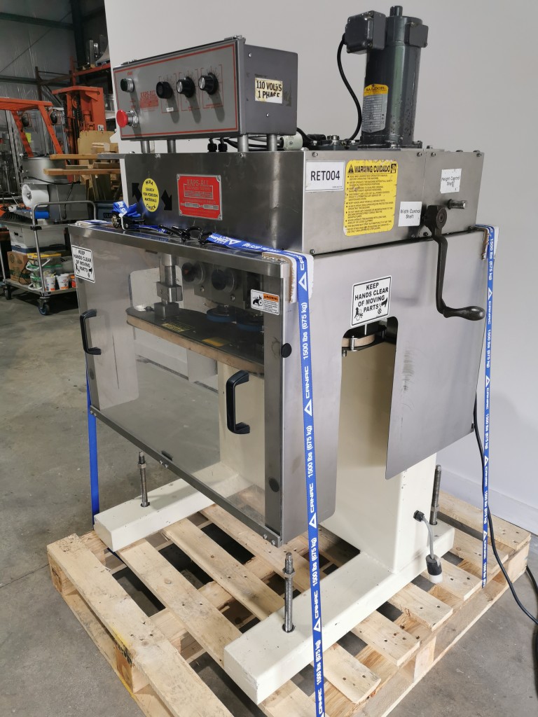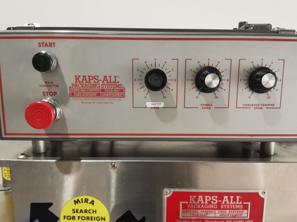 4 spindle cap retorquer with 1 set of side gripper belts. It can do up to a 5.25" (133 mm) wide cap. It has variable speed controls for the spindles and side belts. Hand crank adjustments. Height adjustable legs. Mild steel base with stainless top. It has removable plexiglass covering the front and back for safety but no safety switches are on them. In good working condition. Last used in a pharmaceutical facility.