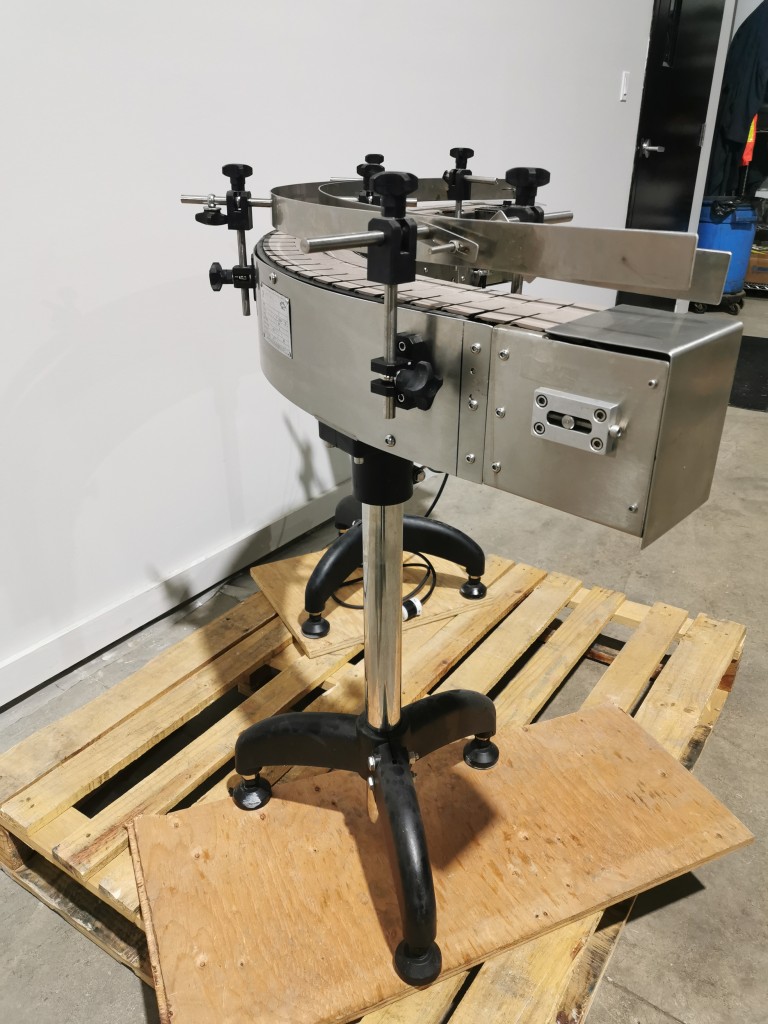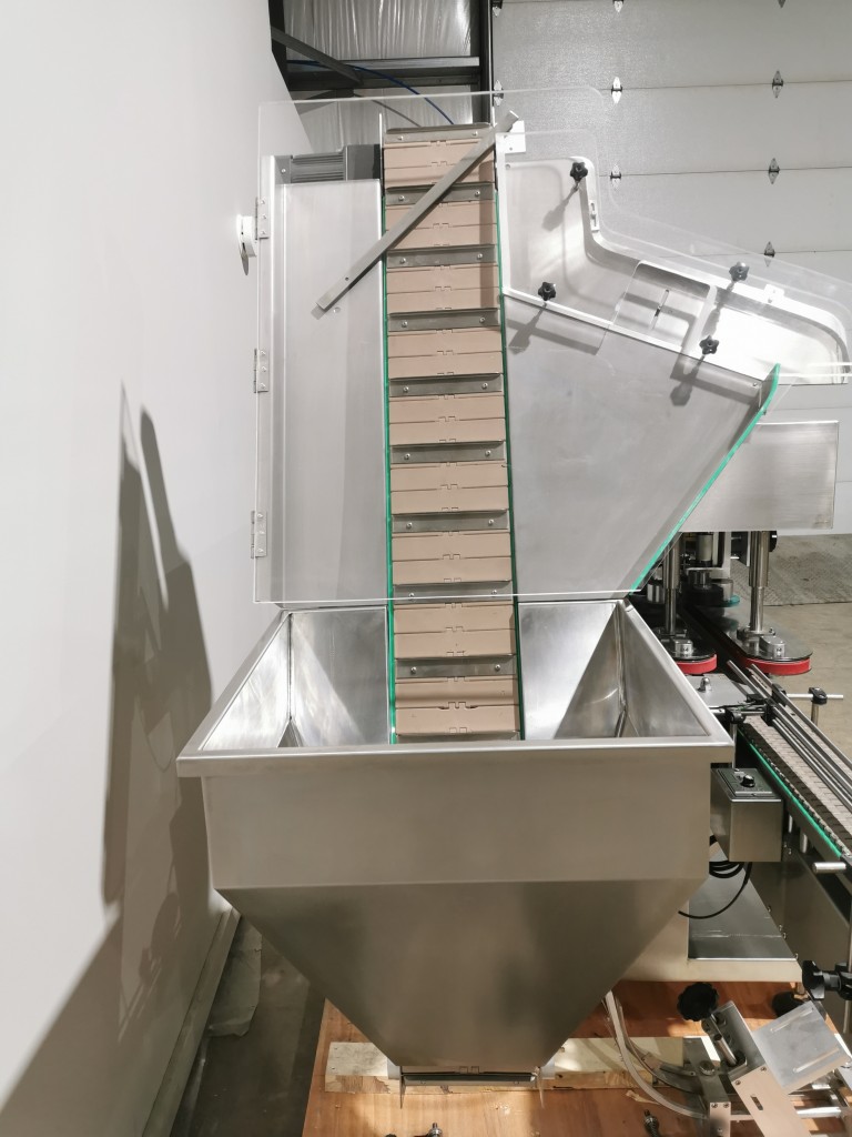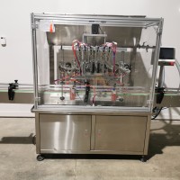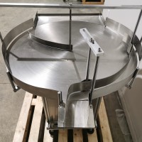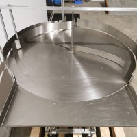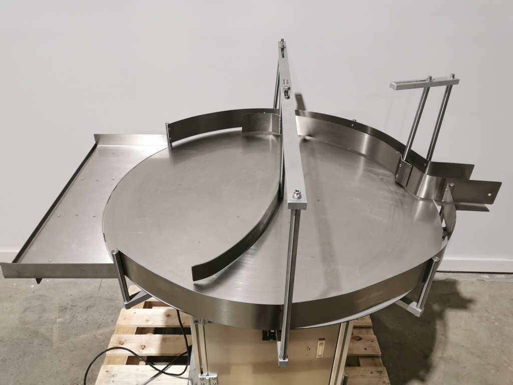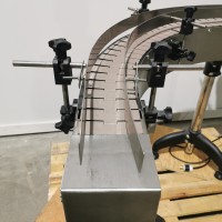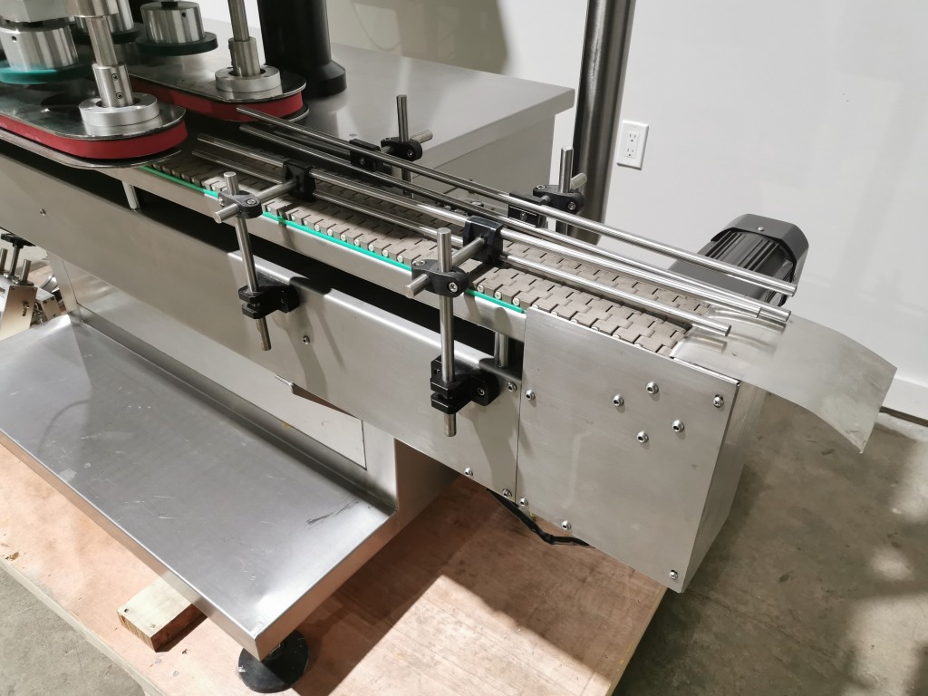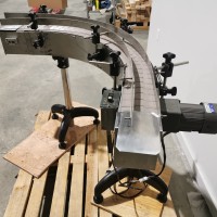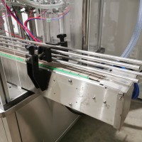 All stainless steel system. Bottle feed table (model GP-1000, serial 2813-01) is 39.75" diameter with variable speed controls. It feeds the 6 head in line piston filler (serial 2030cy0074). The hopper is 50.25" wide x 19.5" long x 15.75" deep. The conveyor is 98.5" long x 3.25" wide table top chain. It has 500 ml pistons and can fill from 100 ml to 500 ml. The nozzles are 0.25" diameter. Touch screen controls. It can run 20 to 30 bottles per minute. Comes an extra set of 1 litre pistons it can fill from 200 ml up to 1 litre as well as a 2nd set of nozzles. The 90 deg conveyor has 4.5" wide table to chain belting and is variable speed. It feeds the 6 spindle capper (model xG 120B, serial 2813-03). The capper has a raised bed conveyor that's 99" long x 4.5" wide table top chain. It has an adjustable cap chute with a spacing wheel and single side belt drive. Rated for caps sizes from 38 mm up to 70 mm. Touch screen controls. In good working condition. Last running hand sanitizer.