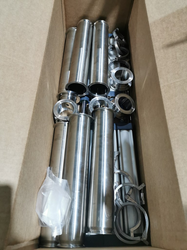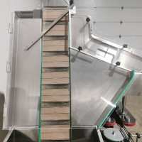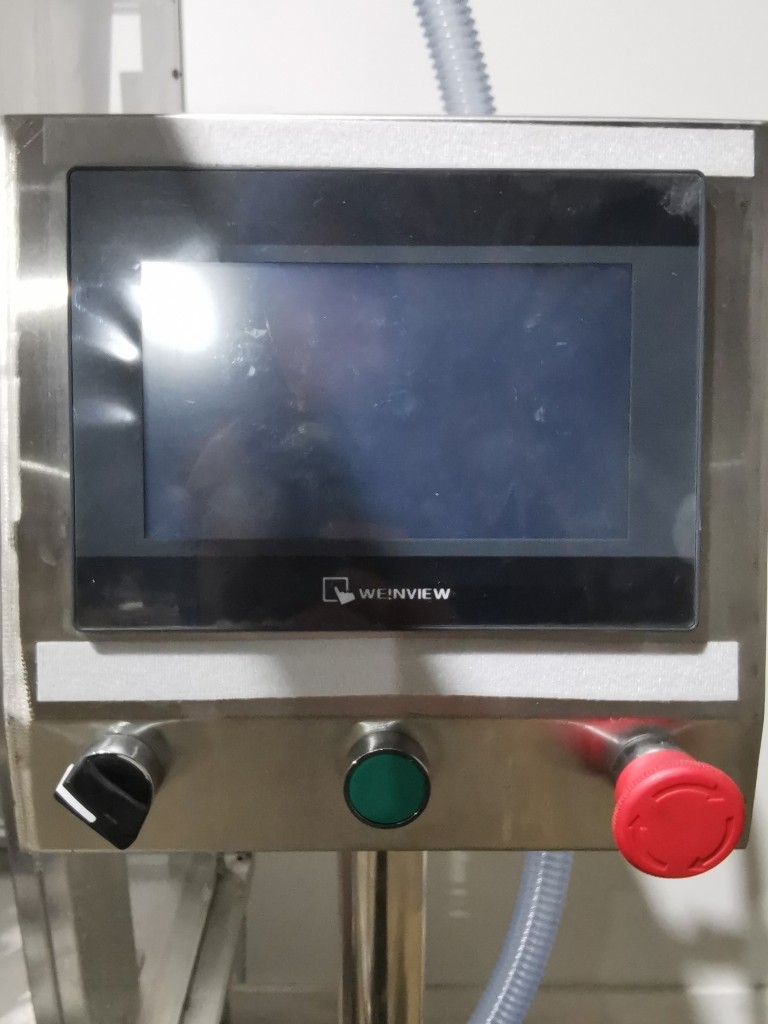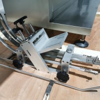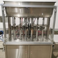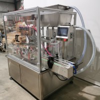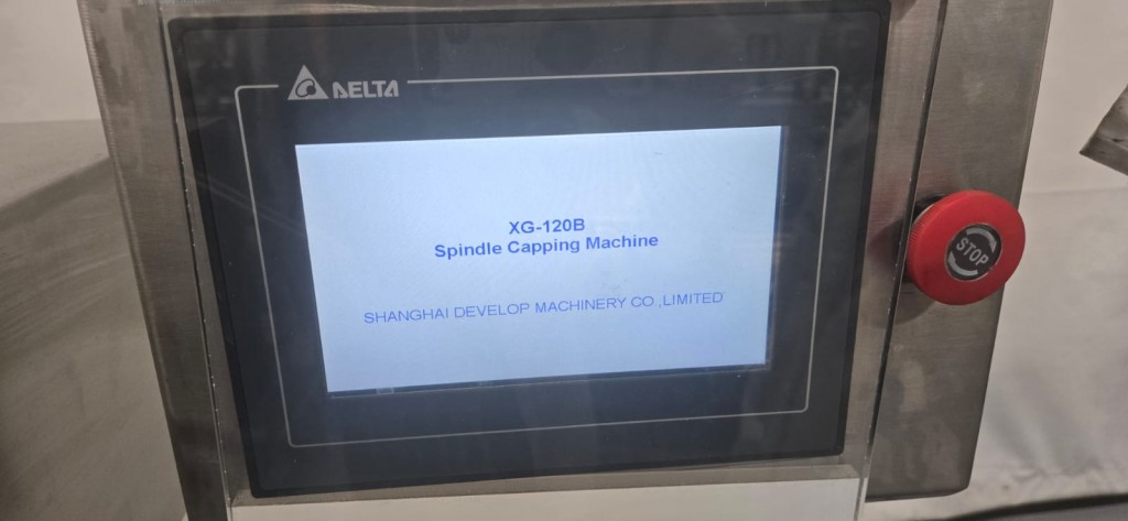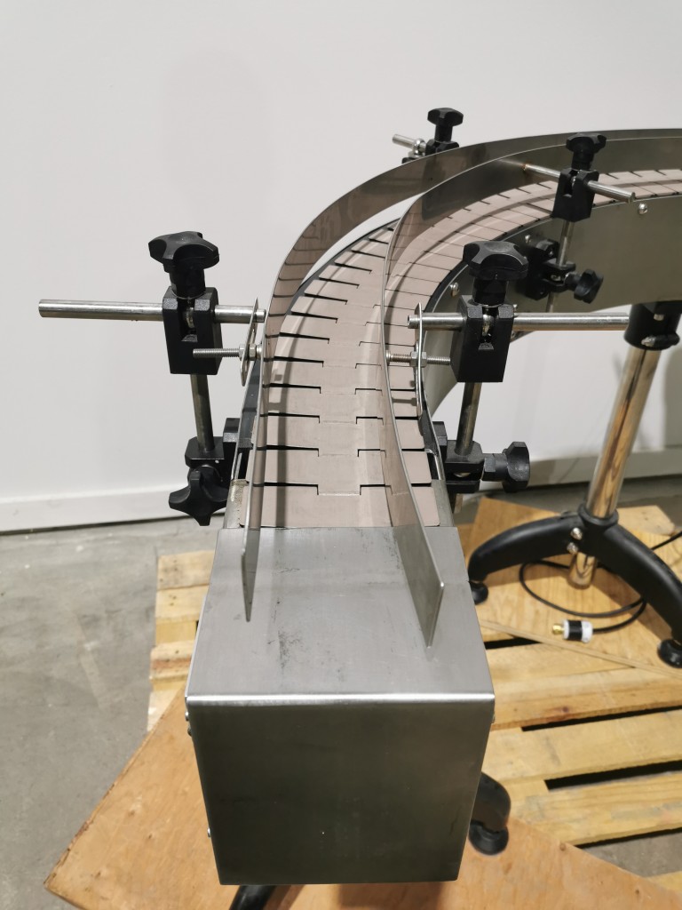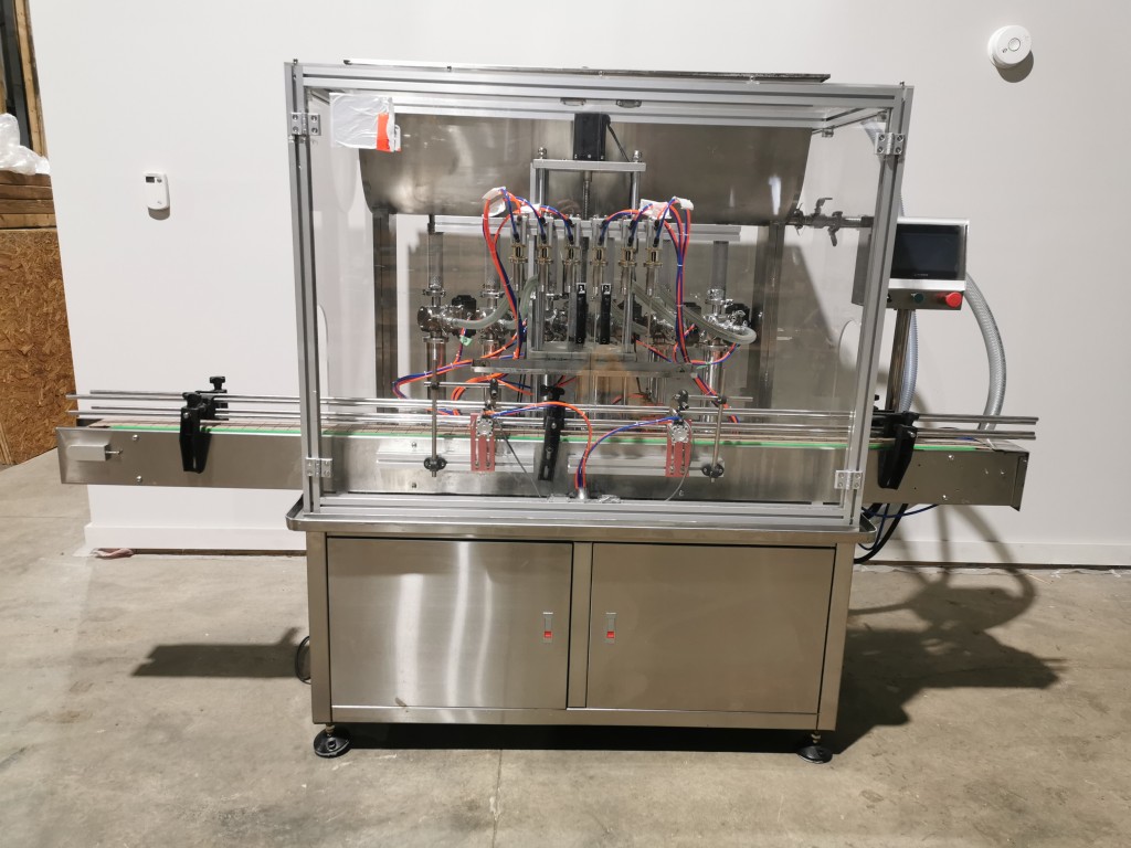 All stainless steel system. Bottle feed table (model GP-1000, serial 2813-01) is 39.75" diameter with variable speed controls. It feeds the 6 head in line piston filler (serial 2030cy0074). The hopper is 50.25" wide x 19.5" long x 15.75" deep. The conveyor is 98.5" long x 3.25" wide table top chain. It has 500 ml pistons and can fill from 100 ml to 500 ml. The nozzles are 0.25" diameter. Touch screen controls. It can run 20 to 30 bottles per minute. Comes an extra set of 1 litre pistons it can fill from 200 ml up to 1 litre as well as a 2nd set of nozzles. The 90 deg conveyor has 4.5" wide table to chain belting and is variable speed. It feeds the 6 spindle capper (model xG 120B, serial 2813-03). The capper has a raised bed conveyor that's 99" long x 4.5" wide table top chain. It has an adjustable cap chute with a spacing wheel and single side belt drive. Rated for caps sizes from 38 mm up to 70 mm. Touch screen controls. In good working condition. Last running hand sanitizer.