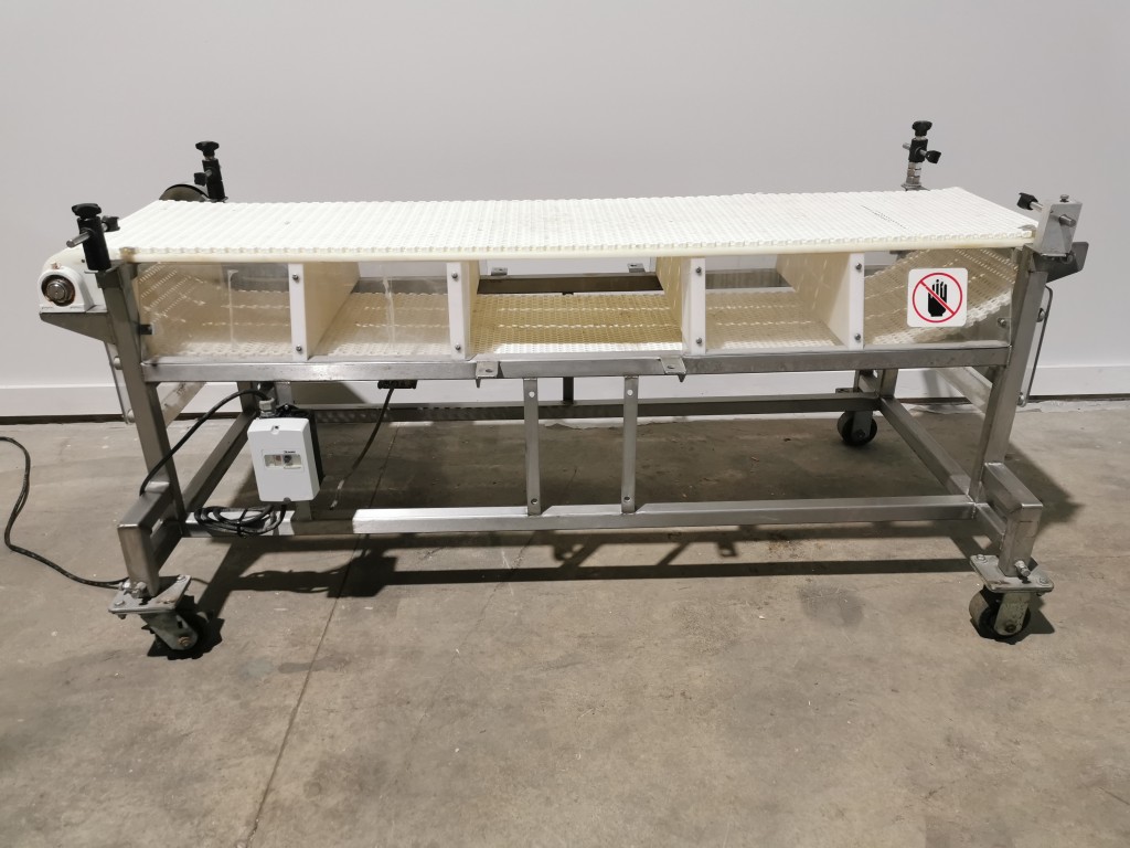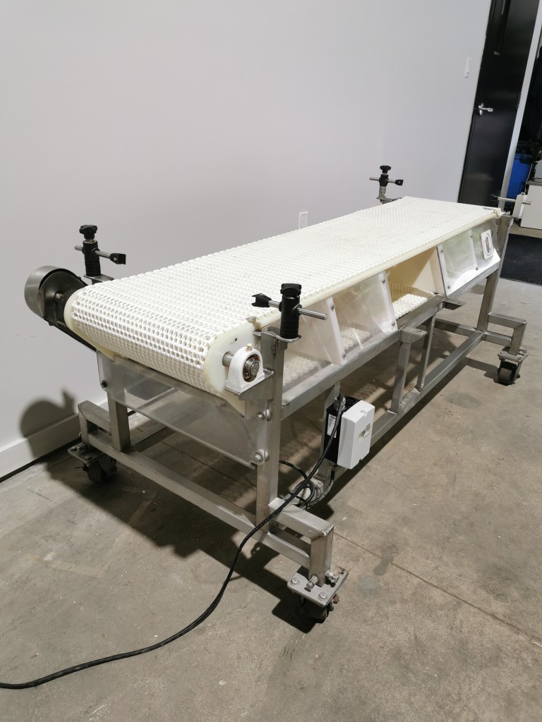 Inquire About This ProductItem #: 6118All stainless steel conveyor with white Intralox belt. The belt is 16" wide x 72" long and is 28.5" from the floor. On casters. In good working condition. Last used in a food facility.