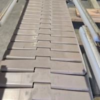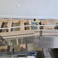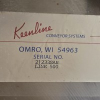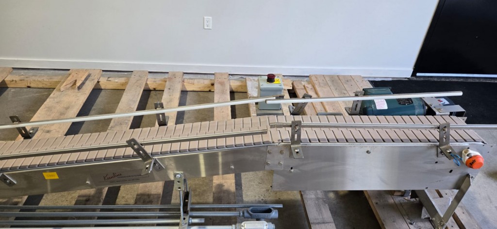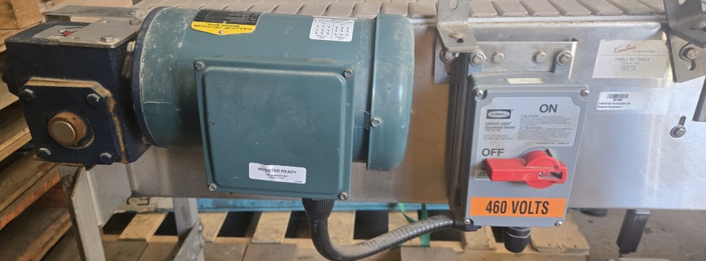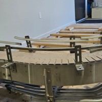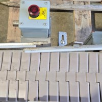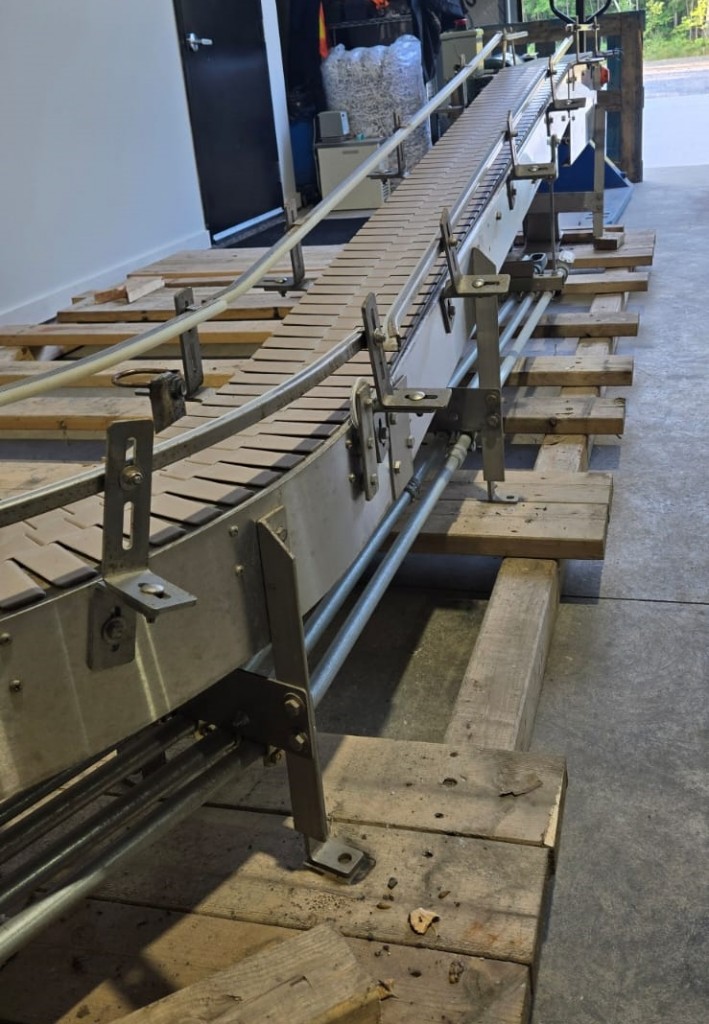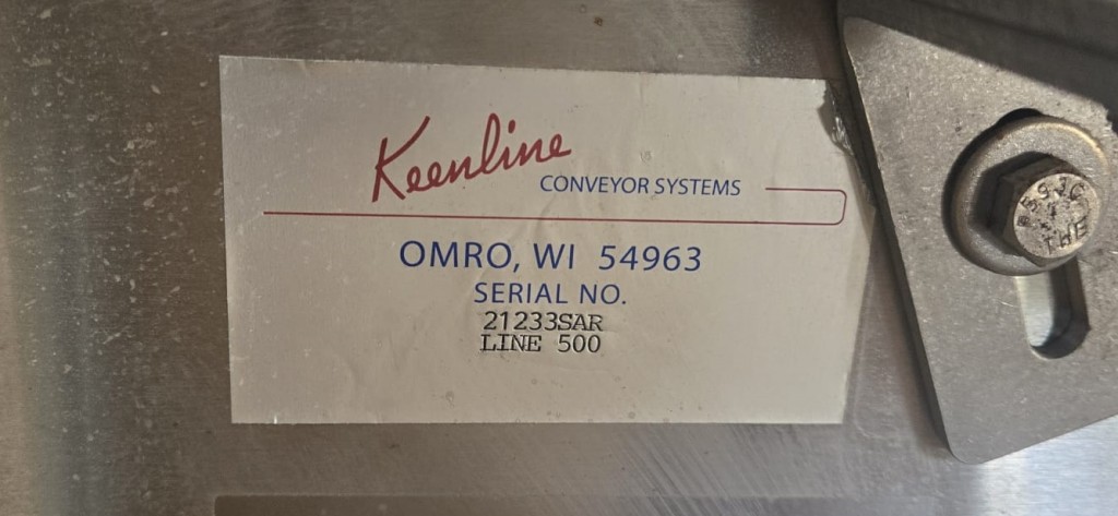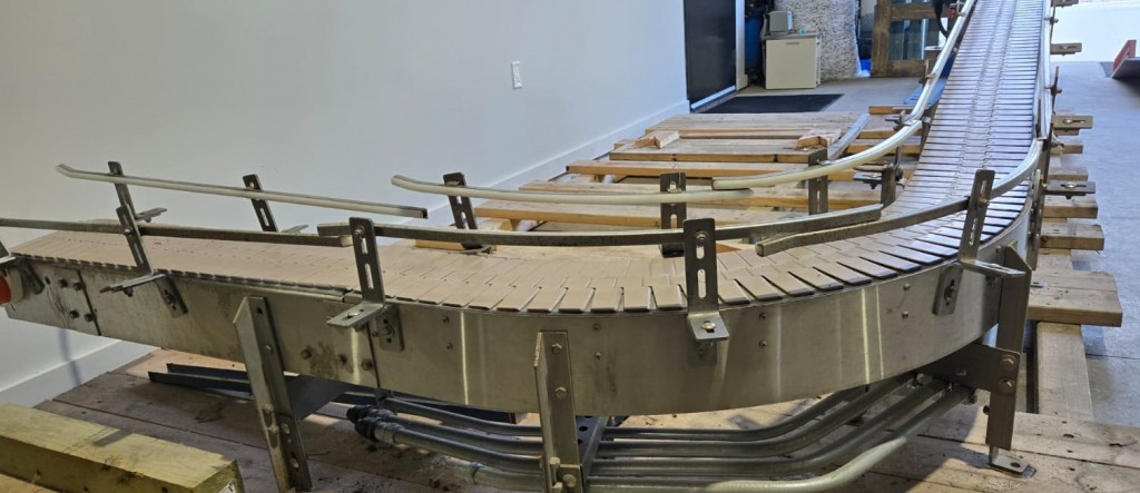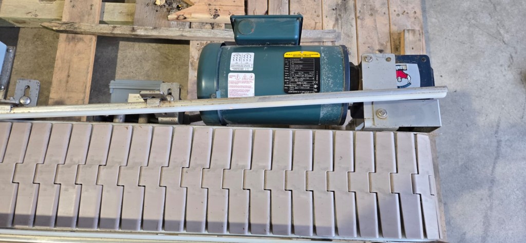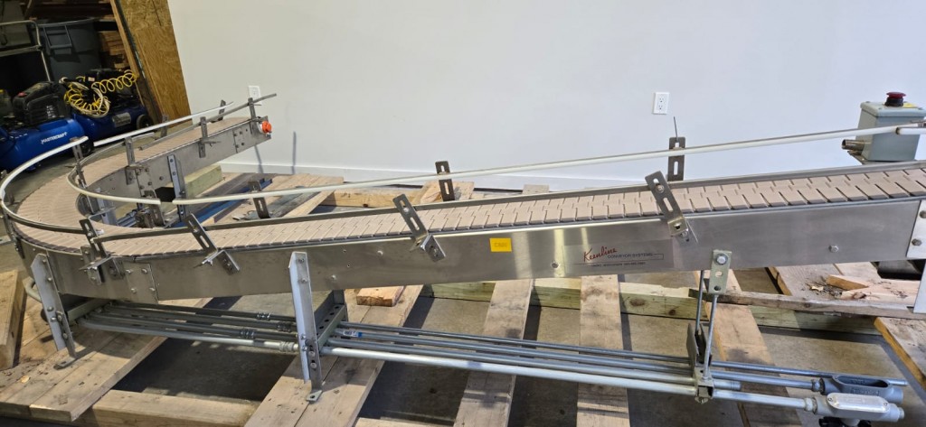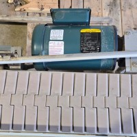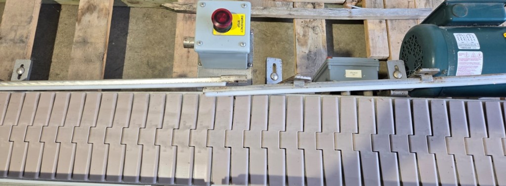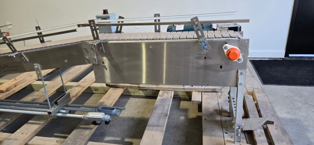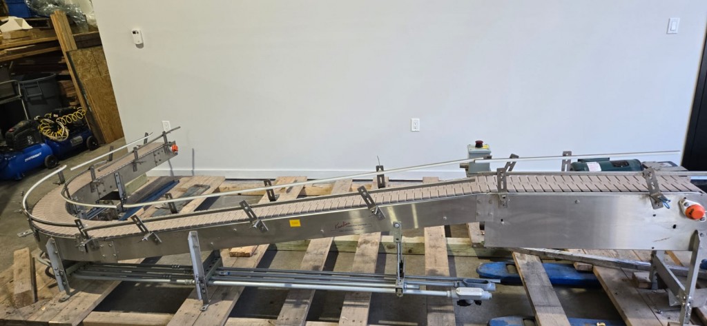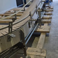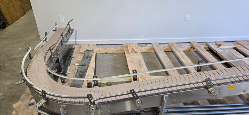 This 90 degree conveyor is 6' long at the infeed and 12' long from the 90 to the end. The conveyor is currently on an incline and goes from 16" to a discharge height of approximately 28". The belt is a 7.5" wide table top chain. The conveyor channel is stainless steel with a single guide rail running the length. In good condition.