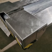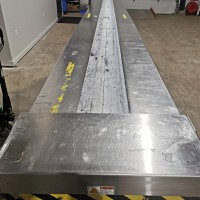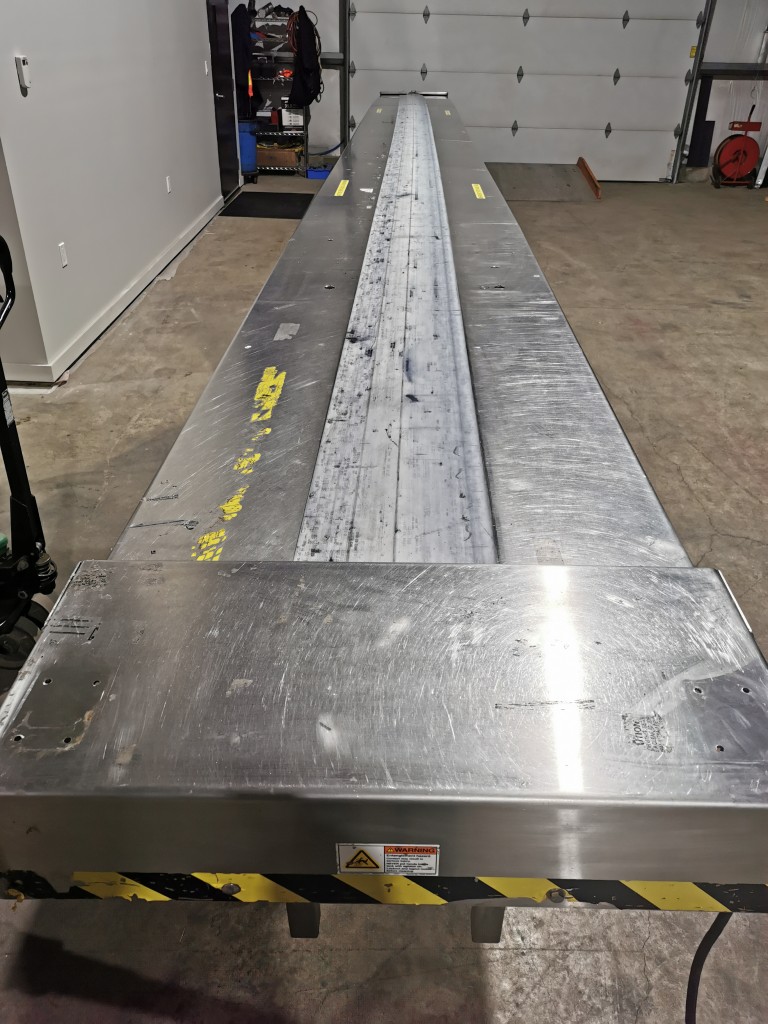 All stainless steel pack off conveyor. It's 32" wide with a 11" wide belt running down the centre x 420" long (395" long belt section). Variable speed controls. It has an air line running down the length of the conveyor down by the base with 5 double outlets. There are height adjust feet with it. In good working condition. Last used in a cosmetic facility.
