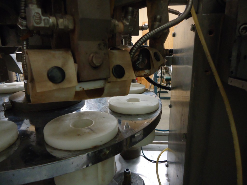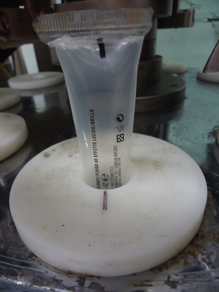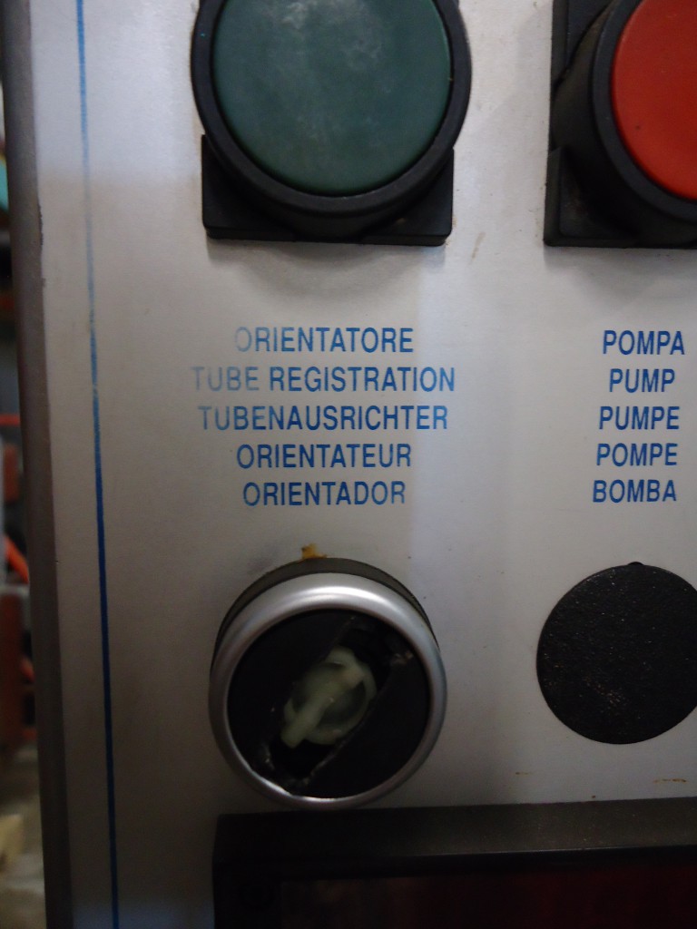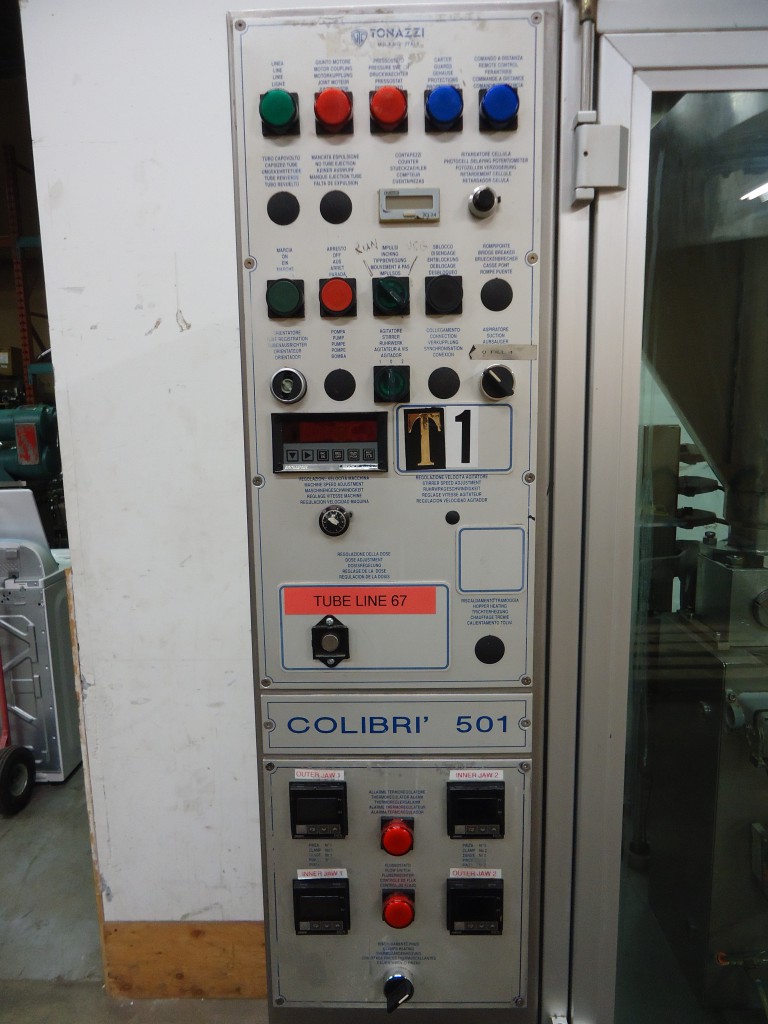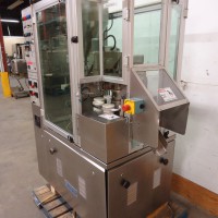 9 station manual load rotary tube filler. The hopper is 16.75" diameter x 22" deep. It has a photo eye for no tube no fill. The first station taps down the tube to make sure it's down all the way. It then gets filled. After that there are 2 stations for sealing the tube. Each jaw has it's own digital temperture controls. The next station trims the access plastic, and finally a date stamper before getting ejected. Comes with a few numbers for the stamp coder. There are lockouts on the doors and an emergency stop. Comes with a few spare parts, an extra piston and 4 boxes of pucks for many shapes and sizes of tubes (19.5mm, 20mm, 18.6mm, 23mm, 25mm, 32.5mm, 40mm, plus oval shaped pucks). In good working condition. Last used in a cosmetic facility filling 25 ml tubes.