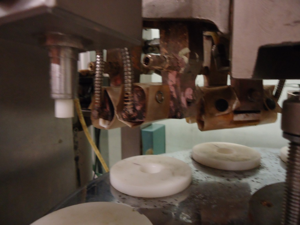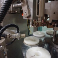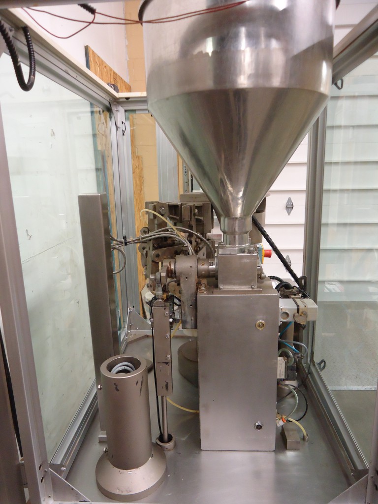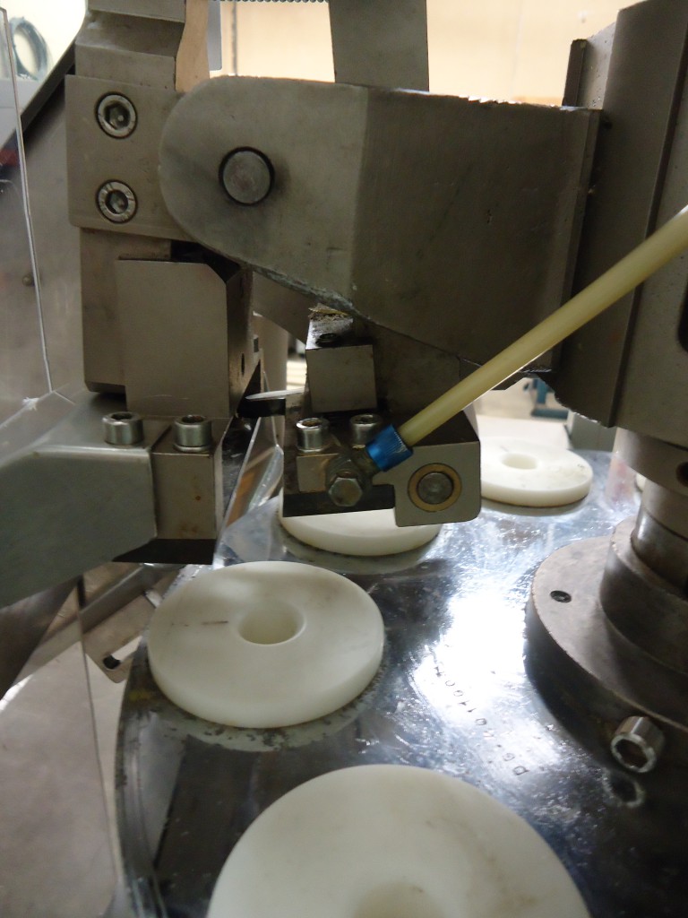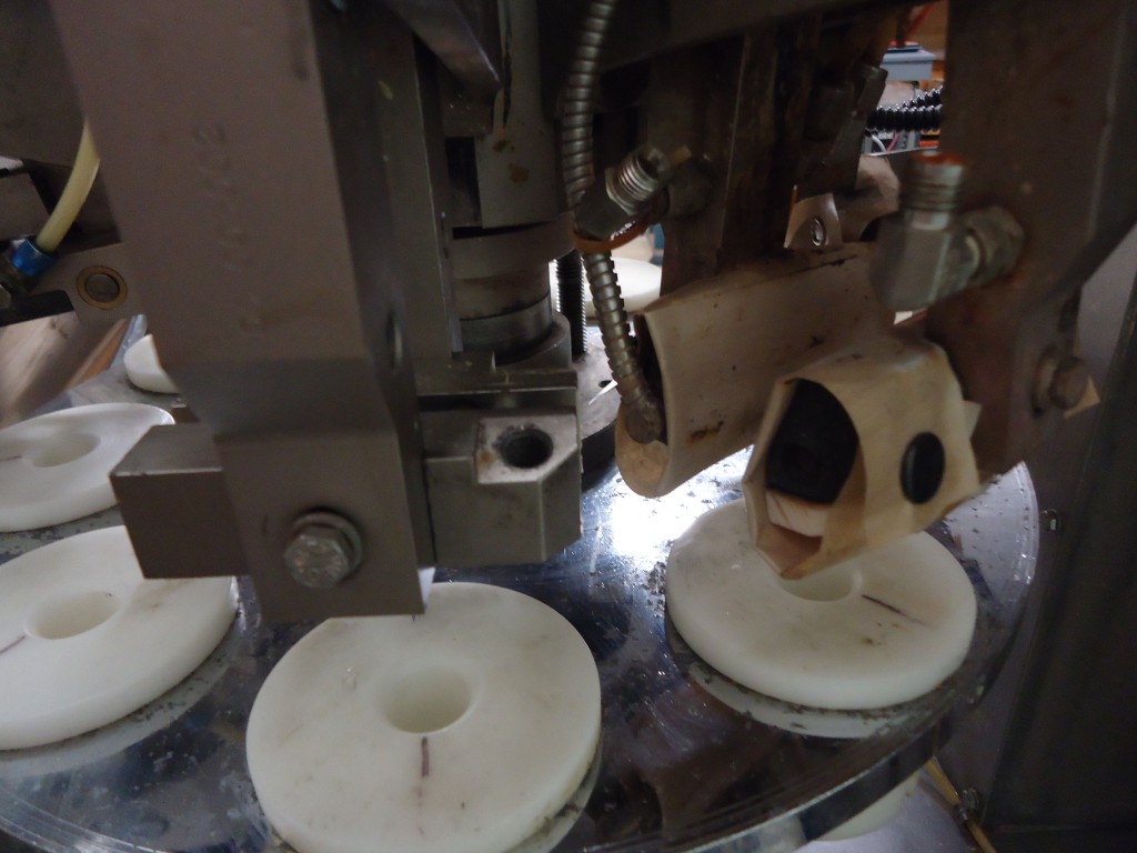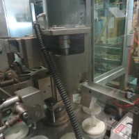 9 station manual load rotary tube filler. The hopper is 16.75" diameter x 22" deep. It has a photo eye for no tube no fill. The first station taps down the tube to make sure it's down all the way. It then gets filled. After that there are 2 stations for sealing the tube. Each jaw has it's own digital temperture controls. The next station trims the access plastic, and finally a date stamper before getting ejected. Comes with a few numbers for the stamp coder. There are lockouts on the doors and an emergency stop. Comes with a few spare parts, an extra piston and 4 boxes of pucks for many shapes and sizes of tubes (19.5mm, 20mm, 18.6mm, 23mm, 25mm, 32.5mm, 40mm, plus oval shaped pucks). In good working condition. Last used in a cosmetic facility filling 25 ml tubes.