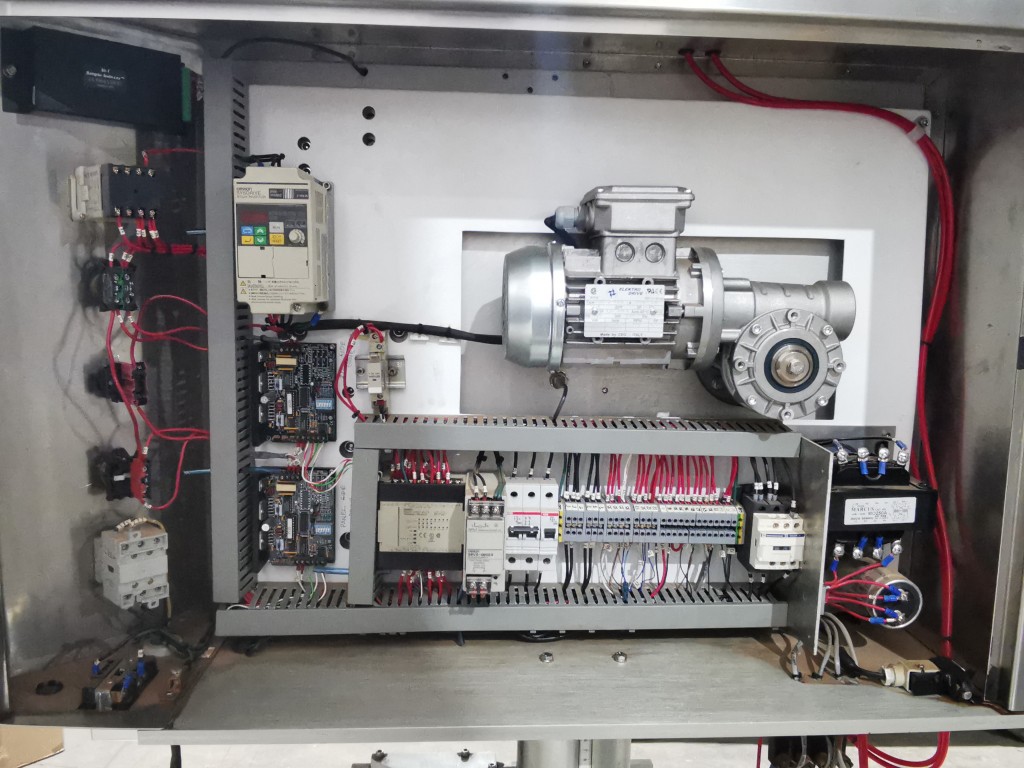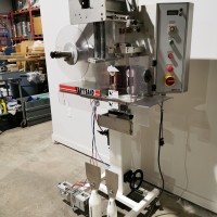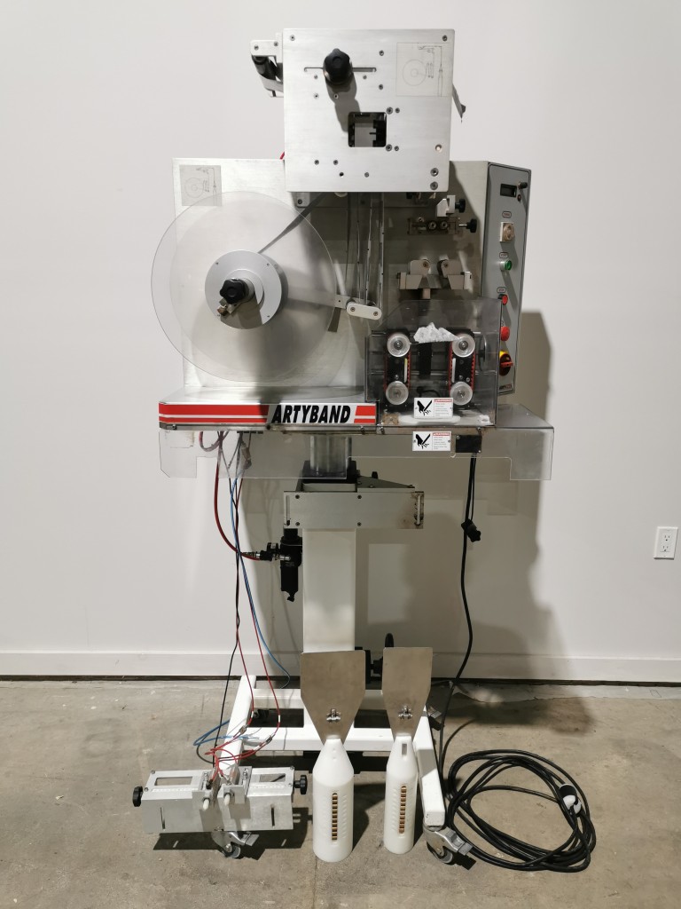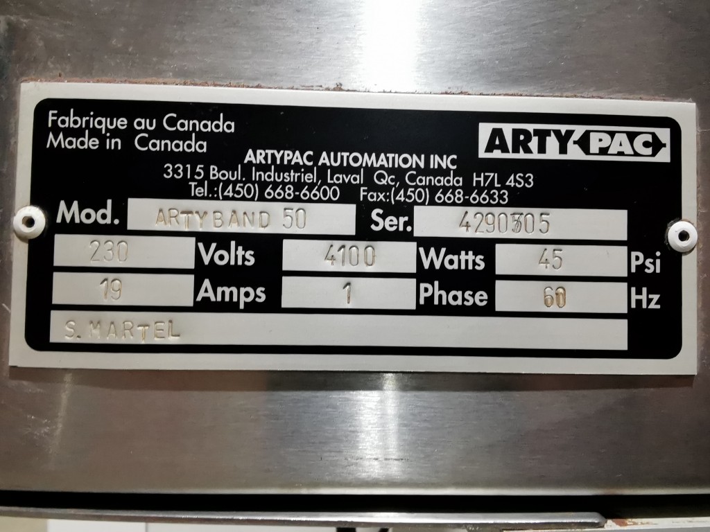 This machine has adjustable height stand and is currently running a 4.5" wide flat band x 5.25" long. It also has a film perforation station. There are 2 mandrels with the machine. The machine has indexing for the container. There is no tunnel with this unit. The spec sheet on the Artyband 50 says the following: