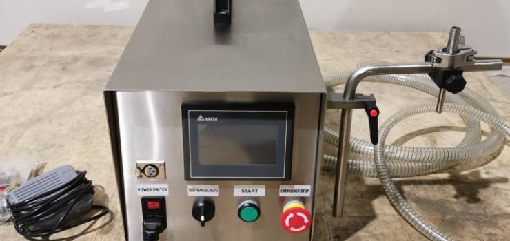 Single head table top piston filler. It has a fill range of 500 to 5000 ml. Hand crank adjustable stroke with reed switches mounted on the cylinder. It has a 3/4" shut of nozzle. It can run in automatic mode or actuated manually by foot switch. There is no hopper. In good working condition. Last used in cosmetic facility.