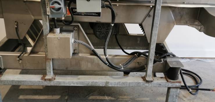 Stainless steel vibratory conveyor / separator with mild steel frame. The conveyor is 16" wide x 64" long and has a 3/8 deflection. The screen has 0.25" mesh. The smaller items fall through the screen and comes out the end. The outlet is 16" wide x 5.5" long and is 25.25" from the floor. The items on top of the screen fall out the side 7" diameter outlet that's 27.5" from the floor. It has an on / off switch. In good condition. Last used in a bakery feeding a bucket elevator.