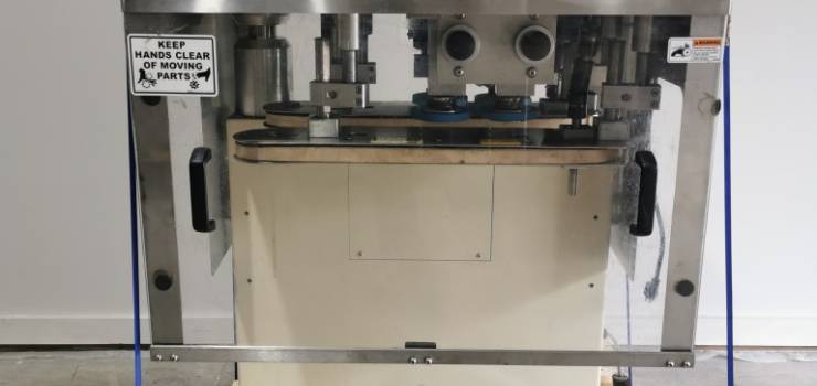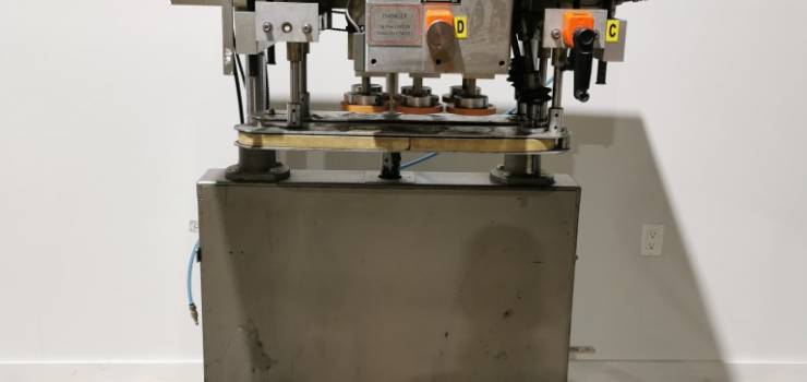 4 spindle cap retorquer with 1 set of side gripper belts. It can do up to a 5.25" (133 mm) wide cap. It has variable speed controls for the spindles and side belts. Hand crank adjustments. Height adjustable legs. Mild steel base with stainless top. It has removable plexiglass covering the front and back for safety but no safety switches are on them. In good working condition. Last used in a pharmaceutical facility.