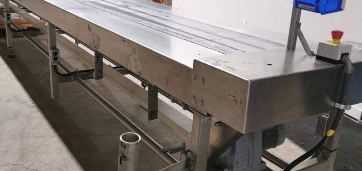 This 90 degree conveyor is 6' long at the infeed and 12' long from the 90 to the end. The conveyor is currently on an incline and goes from 16" to a discharge height of approximately 28". The belt is a 7.5" wide table top chain. The conveyor channel is stainless steel with a single guide rail running the length. In good condition.