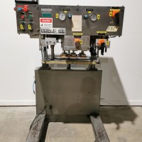 6 spindle retorquer. Single side drive belts. Hand crank adjustments for the gripper belt and spindles. A motor raises and lowers the unit for your bottle height. It will do up to 4.25" (107 mm) wide cap. Variable speed controls. In good working condition. On casters.