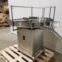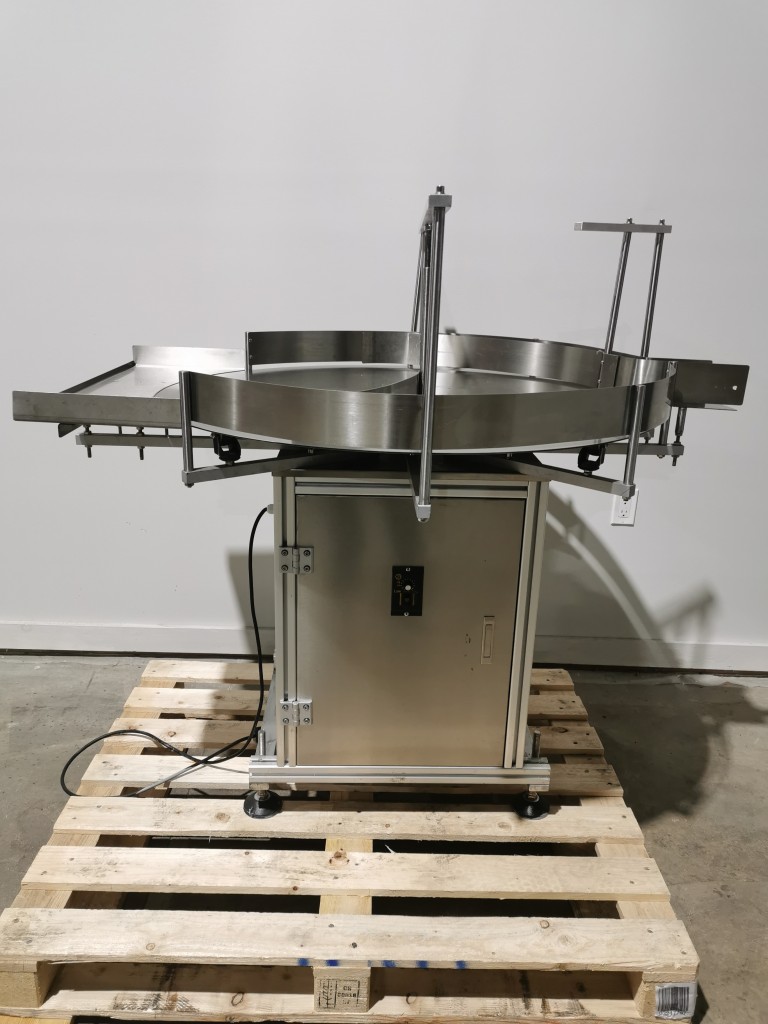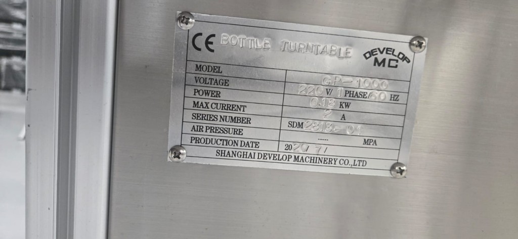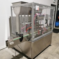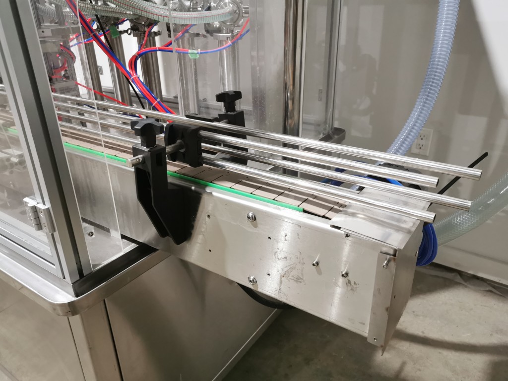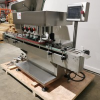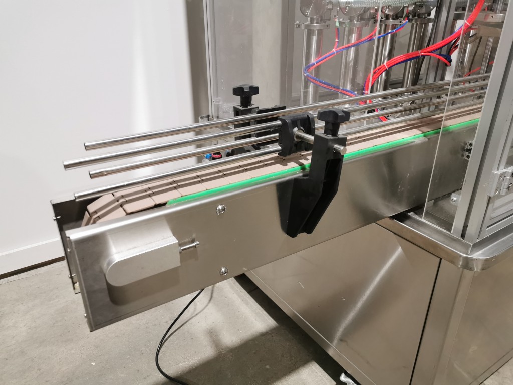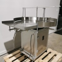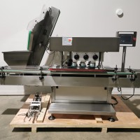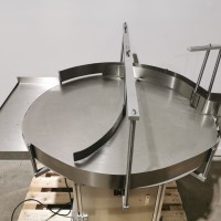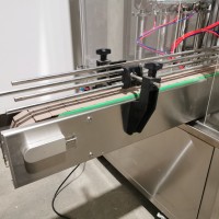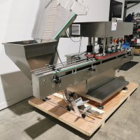 All stainless steel system. Bottle feed table (model GP-1000, serial 2813-01) is 39.75" diameter with variable speed controls. It feeds the 6 head in line piston filler (serial 2030cy0074). The hopper is 50.25" wide x 19.5" long x 15.75" deep. The conveyor is 98.5" long x 3.25" wide table top chain. It has 500 ml pistons and can fill from 100 ml to 500 ml. The nozzles are 0.25" diameter. Touch screen controls. It can run 20 to 30 bottles per minute. Comes an extra set of 1 litre pistons it can fill from 200 ml up to 1 litre as well as a 2nd set of nozzles. The 90 deg conveyor has 4.5" wide table to chain belting and is variable speed. It feeds the 6 spindle capper (model xG 120B, serial 2813-03). The capper has a raised bed conveyor that's 99" long x 4.5" wide table top chain. It has an adjustable cap chute with a spacing wheel and single side belt drive. Rated for caps sizes from 38 mm up to 70 mm. Touch screen controls. In good working condition. Last running hand sanitizer.