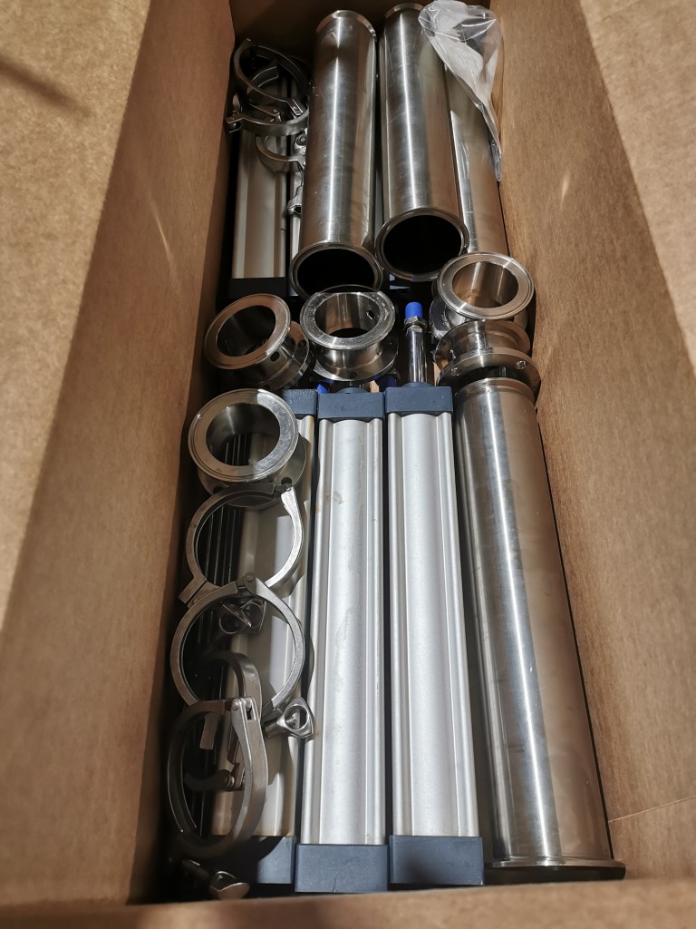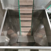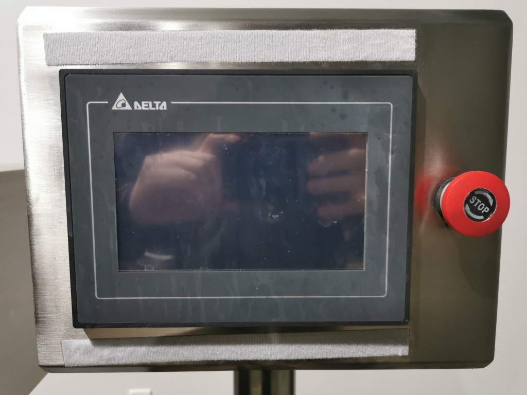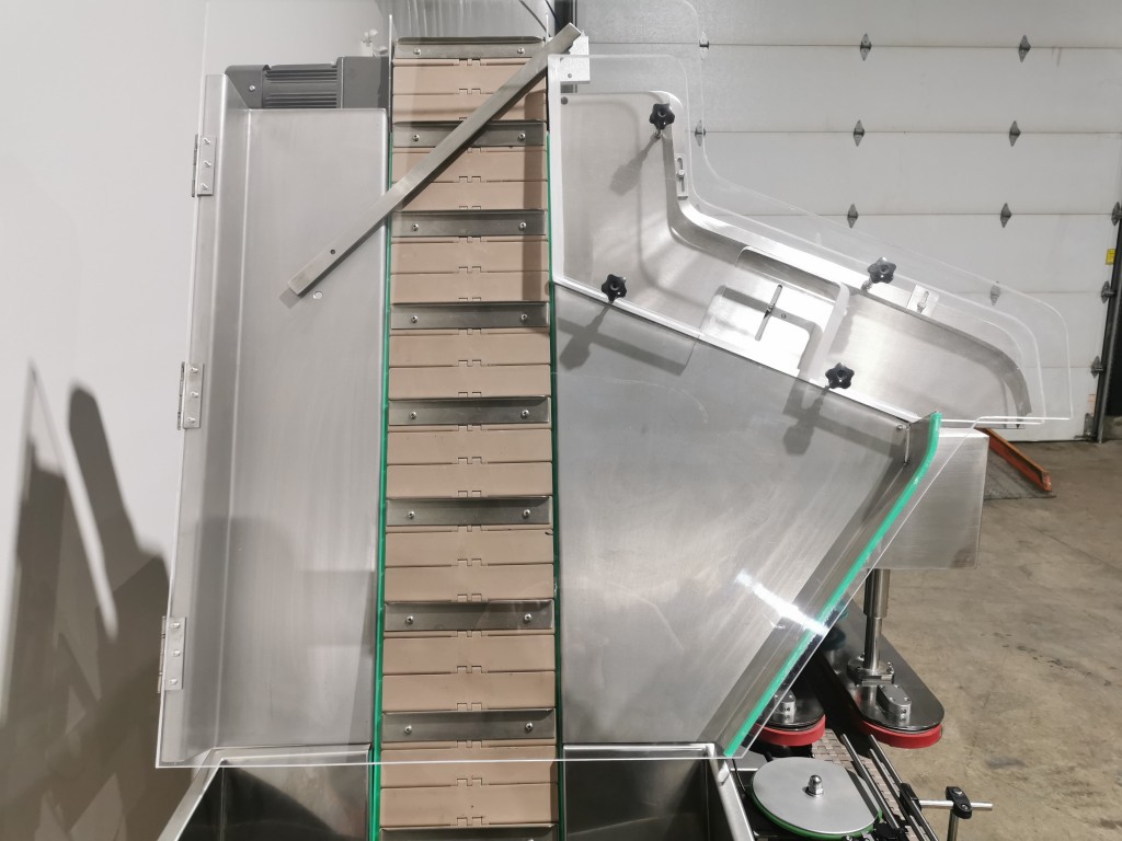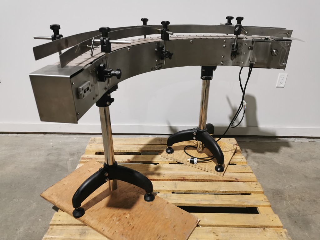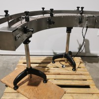 All stainless steel system. Bottle feed table (model GP-1000, serial 2813-01) is 39.75" diameter with variable speed controls. It feeds the 6 head in line piston filler (serial 2030cy0074). The hopper is 50.25" wide x 19.5" long x 15.75" deep. The conveyor is 98.5" long x 3.25" wide table top chain. It has 500 ml pistons and can fill from 100 ml to 500 ml. The nozzles are 0.25" diameter. Touch screen controls. It can run 20 to 30 bottles per minute. Comes an extra set of 1 litre pistons it can fill from 200 ml up to 1 litre as well as a 2nd set of nozzles. The 90 deg conveyor has 4.5" wide table to chain belting and is variable speed. It feeds the 6 spindle capper (model xG 120B, serial 2813-03). The capper has a raised bed conveyor that's 99" long x 4.5" wide table top chain. It has an adjustable cap chute with a spacing wheel and single side belt drive. Rated for caps sizes from 38 mm up to 70 mm. Touch screen controls. In good working condition. Last running hand sanitizer.
