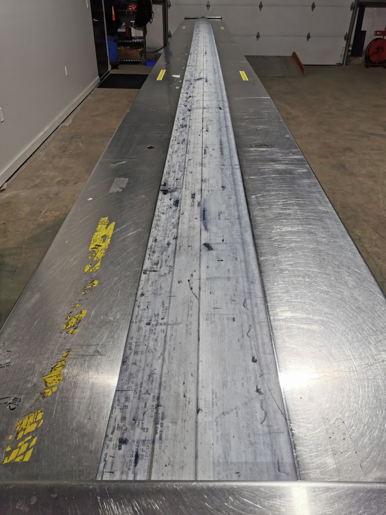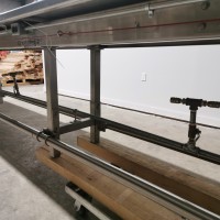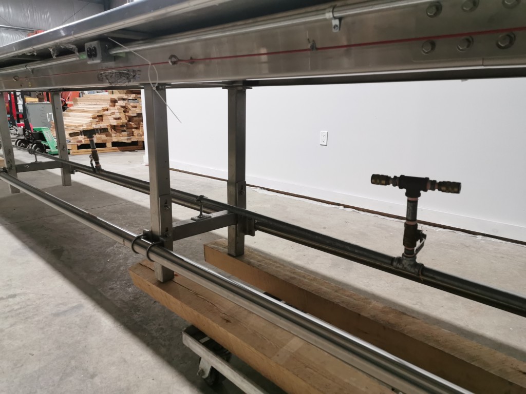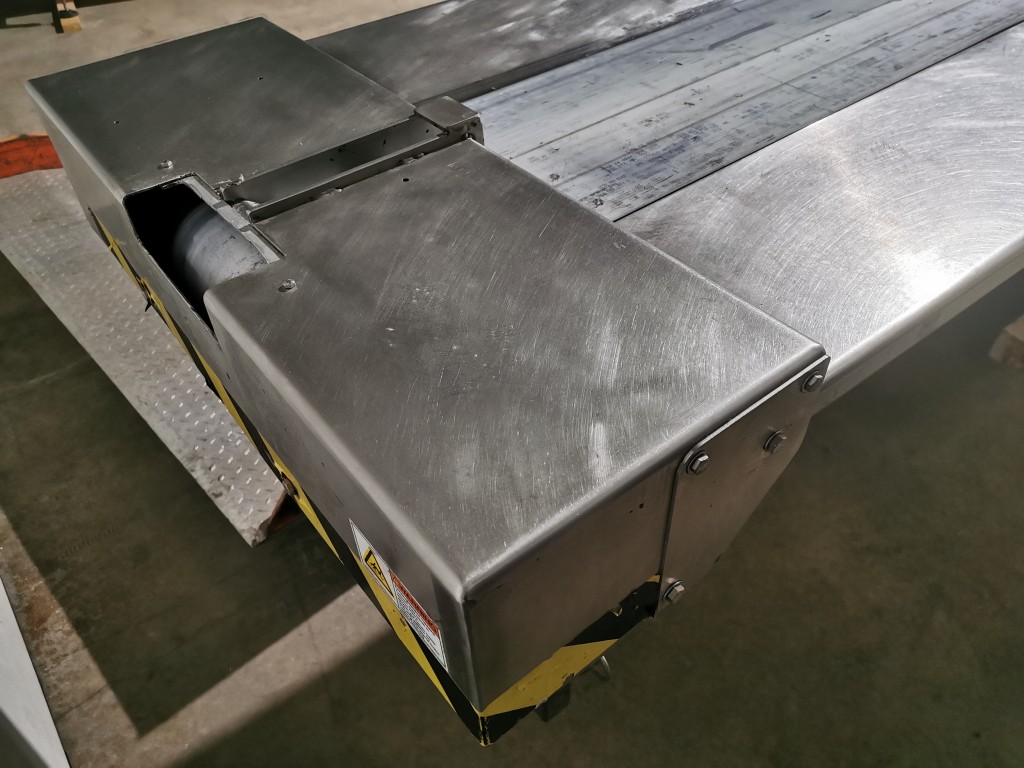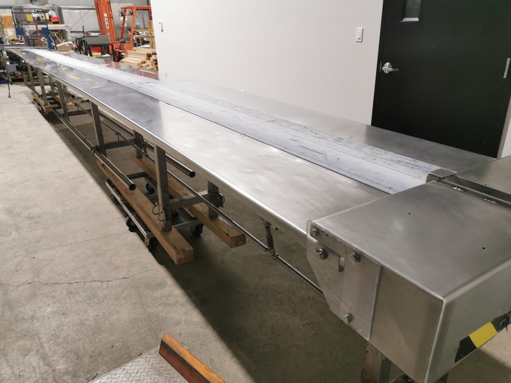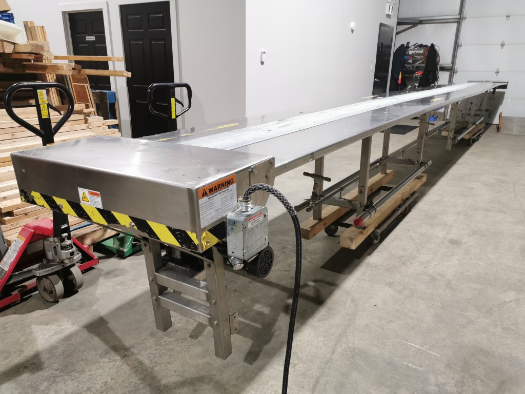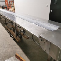 All stainless steel pack off conveyor. It's 32" wide with a 11" wide belt running down the centre x 420" long (395" long belt section). Variable speed controls. It has an air line running down the length of the conveyor down by the base with 5 double outlets. There are height adjust feet with it. In good working condition. Last used in a cosmetic facility.