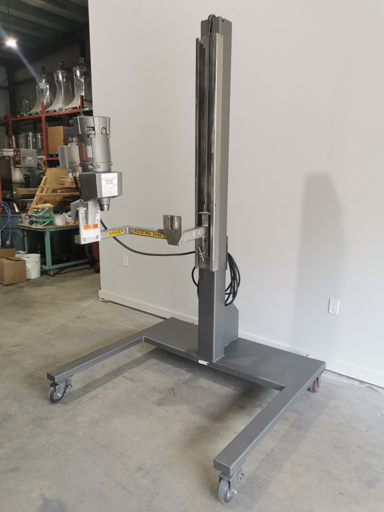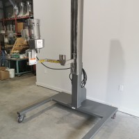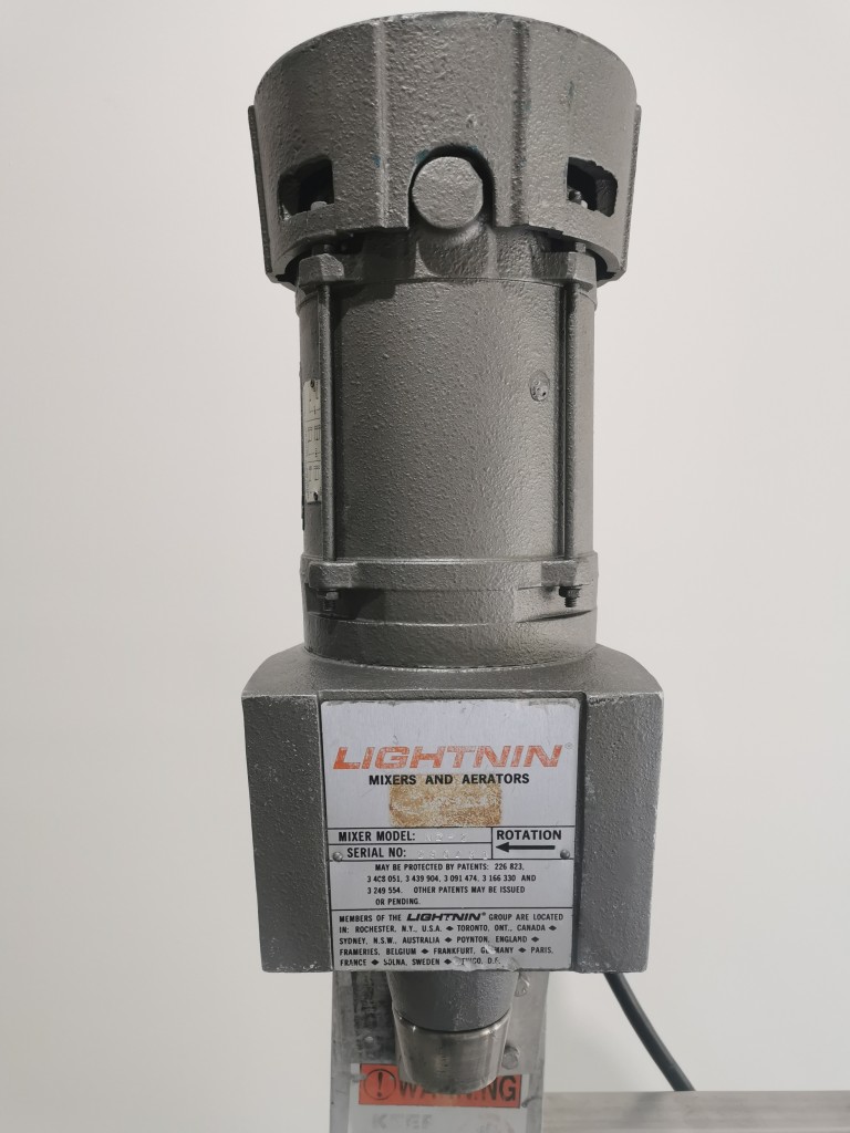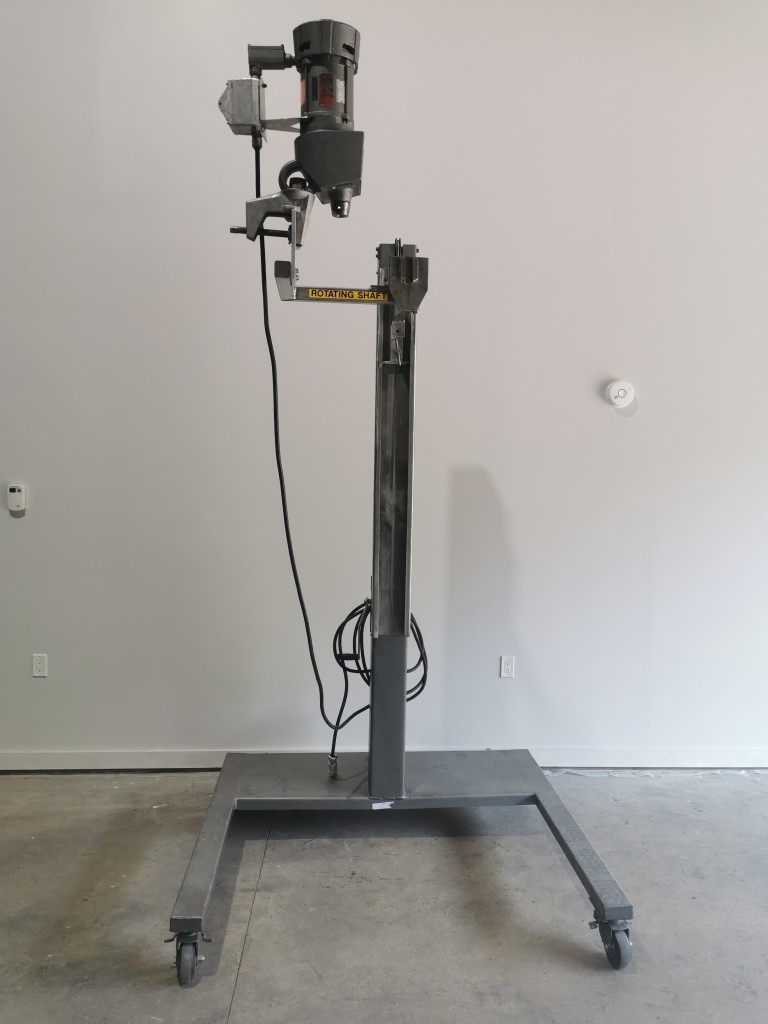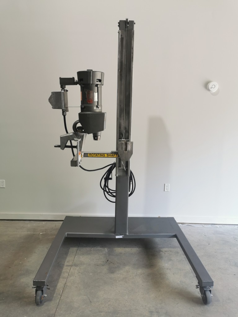 This Lightnin mixer is mounted on a portable stand. The mixer takes a 0.75" diameter shaft. The stand is made by Mass Flow Systems (model MF118RS). It lifts the mixer with a hand crank. Minimum height is 56.25" (from the bottom of the mixer to the floor) up to 96". The frame of the stand is mild steel and is 54" wide x 59" long. In good working condition. Last used in a pharmaceutical facility.