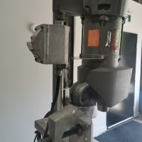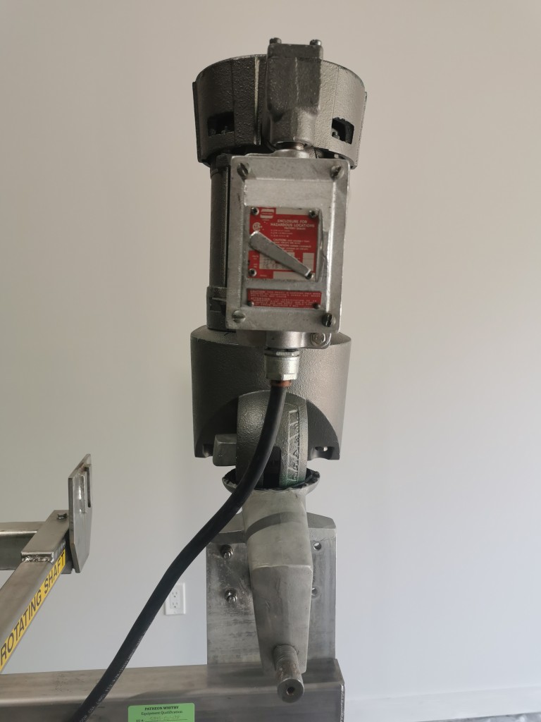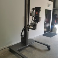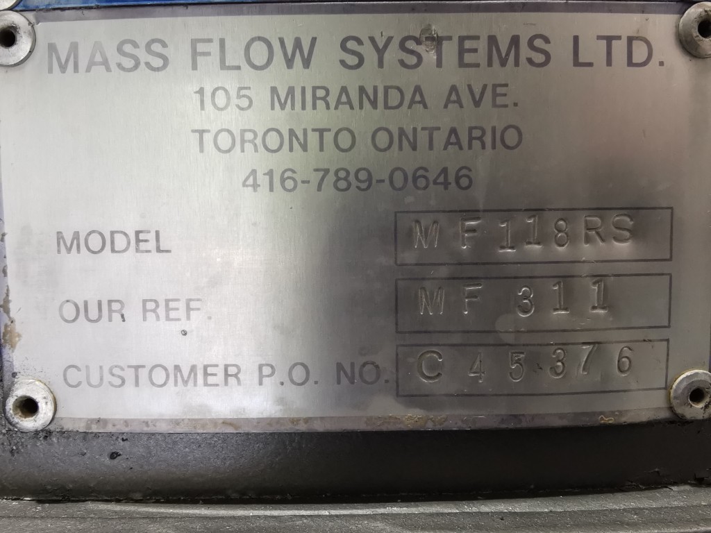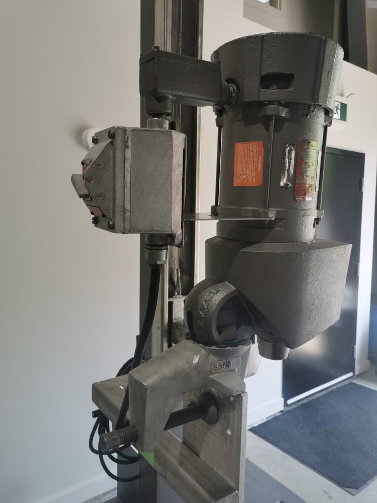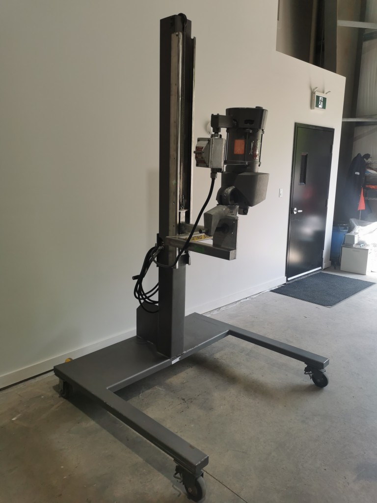This Lightnin mixer is mounted on a portable stand. The mixer takes a 0.75" diameter shaft. The stand is made by Mass Flow Systems (model MF118RS). It lifts the mixer with a hand crank. Minimum height is 56.25" (from the bottom of the mixer to the floor) up to 96". The frame of the stand is mild steel and is 54" wide x 59" long. In good working condition. Last used in a pharmaceutical facility.