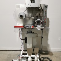 This machine has adjustable height stand and is currently running a 4.5" wide flat band x 5.25" long. It also has a film perforation station. There are 2 mandrels with the machine. The machine has indexing for the container. There is no tunnel with this unit. The spec sheet on the Artyband 50 says the following: