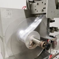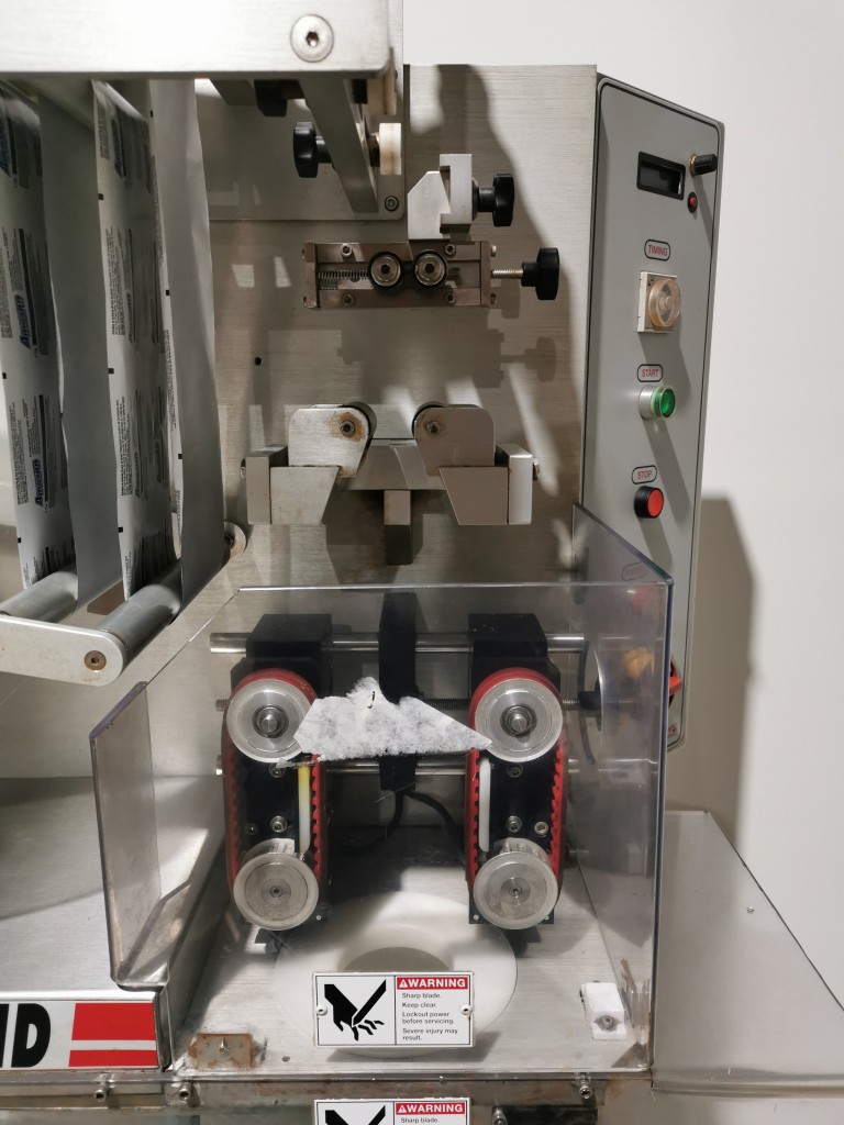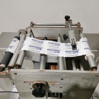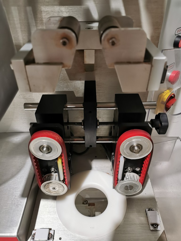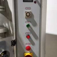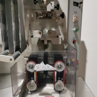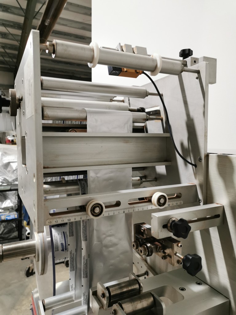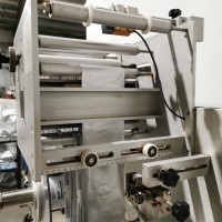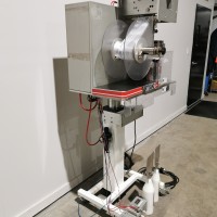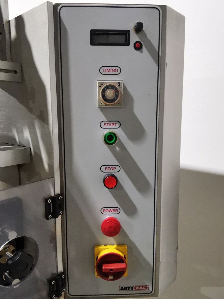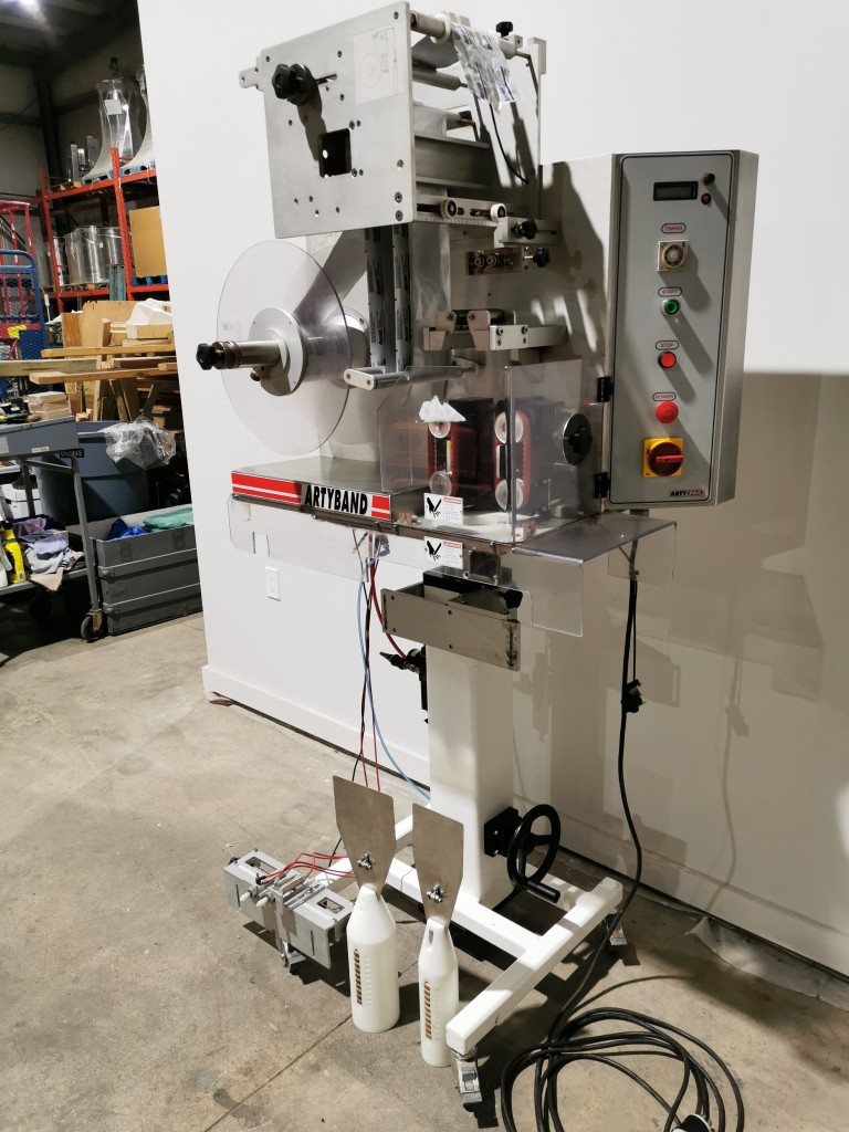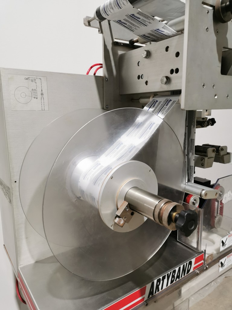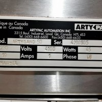 This machine has adjustable height stand and is currently running a 4.5" wide flat band x 5.25" long. It also has a film perforation station. There are 2 mandrels with the machine. The machine has indexing for the container. There is no tunnel with this unit. The spec sheet on the Artyband 50 says the following: