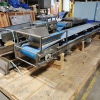 All stainless steel trough conveyor. 28' long (the conveyor on the left). The belt is 18" wide and are food grade with trough idler rollers. In very good condition. Last used to feed cookies into multi head scales.
