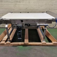 All stainless steel conveyor. The belt is 43" wide x 72" long. It can handle up to a 45.5" wide belt. Each end of the conveyor has an air operated transition plate, but they can be removed. Under the conveyor there is a scraper to clean the belt with a catch tray. it has height adjustable legs, currently 31.75" from the floor. Comes out of a bakery but it has never been used.