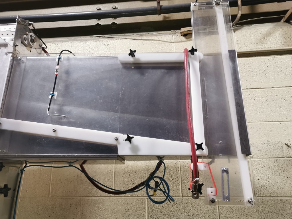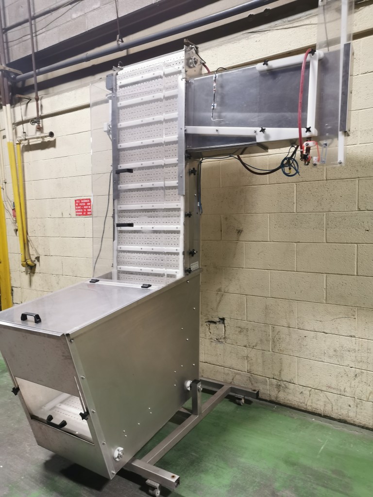 This stainless steel cap sorter has a 24" wide belt. The cleats are 1.5" tall x 0.5" thick. The spacing between cleats is 4.5". The hopper is 24" wide x 28" long x 28" deep. There is a 12" wide x 21" long door on the front of the hopper to clean out caps. It has an adjustable angle. The base is a 48" x 48" frame on casters. In good condition. Manufactured in 2018. Last used in a food facility.