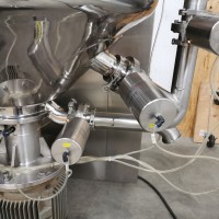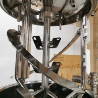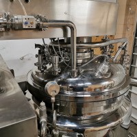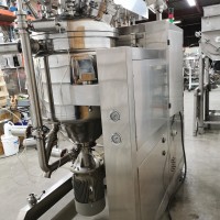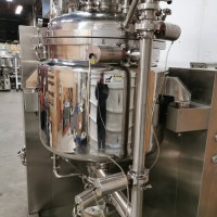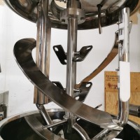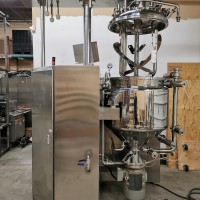 This is a jacketed scrape surface kettle with emulsifier in the bottom and vacuum capabilities. The kettle is 29.5" diameter x 36.75" deep (250 litre capacity). The lid has 2 inlets, 2 spray ball inlets and 2 vacuum ports. There is a viewing port and a light inside that can come on to see inside when mixing. The mixer is single motion scrape surface and can run in forward and reverse. It can run 0 - 64 rpm. The homogenizer is in the bottom centre of the kettle and it can run 0 - 3600 rpm. It has a 3" outside diameter sani clamp connection. The mixer lifts vertically out of the hopper by a hydraulic pump. It is hydro approved and has Allen - Bradley variable speed drives and Seimens smartline touch screen controls. In very good working condition. Comes with an extra homogenizer. Last used in a cosmetic facility. Height fully opened. 136.25" tall.