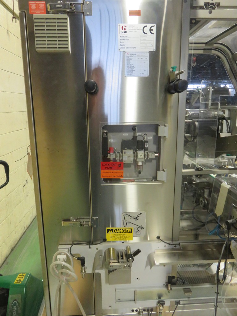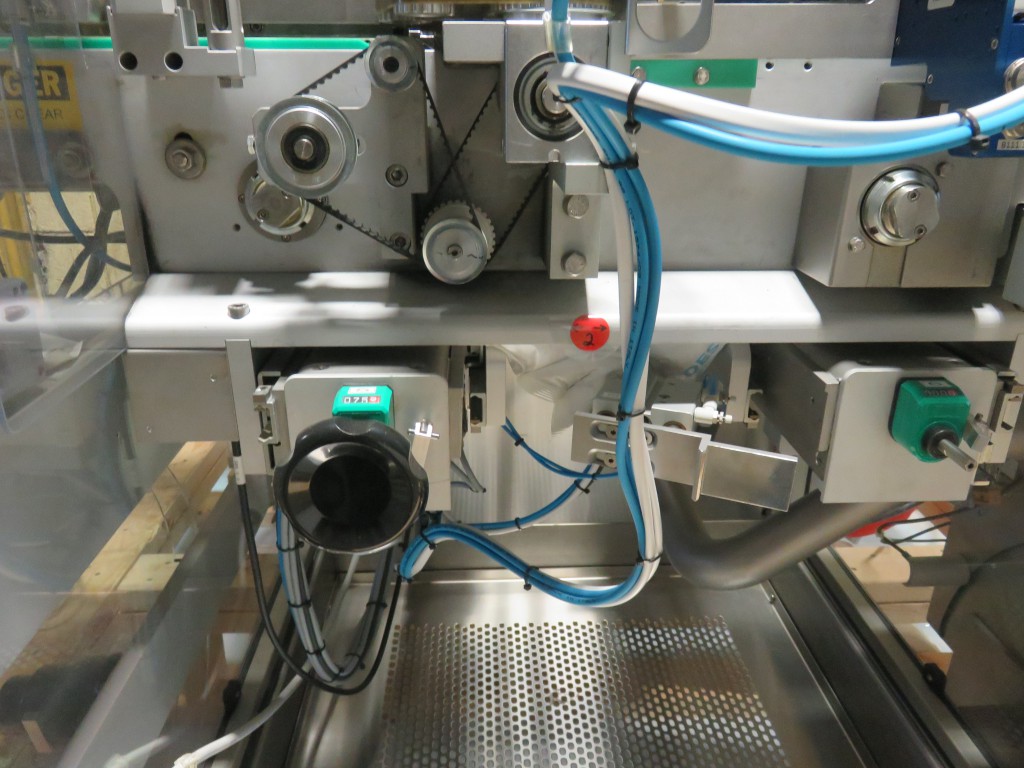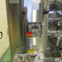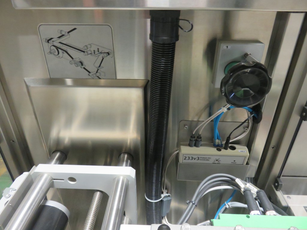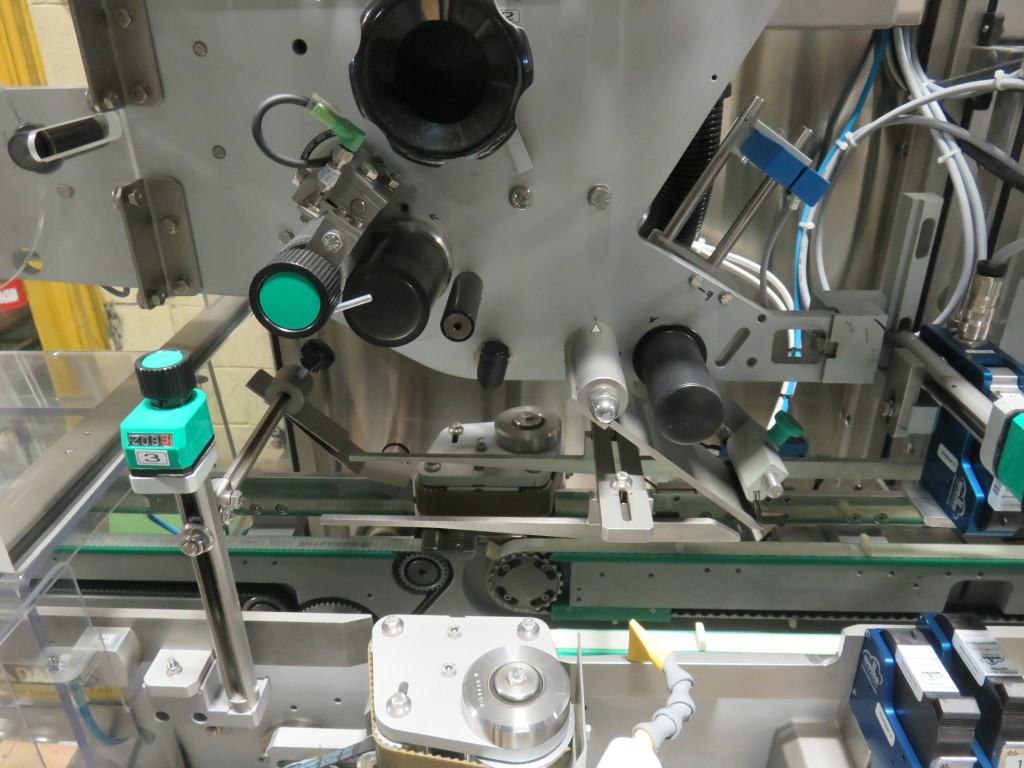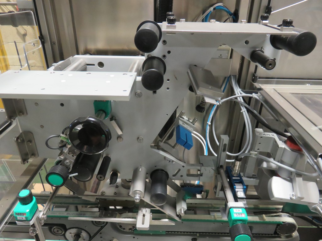 This labeller is designed to apply pressure sensitve labels on the upper side of already formed cartons. The track and trace system on the machine allows you to print and verify a serialized code on the carton. It takes a maximum web reel of 400mm. Cartons are conveyed into the machine by two infeed belts. The cartons are spaced and inserted in time with the toothed belted conveyor that feeds into the labelling zone. The label is applied and a printer prints a barcode on the Vignette. Another ink jet printer prints a serialized code on the upper and lateral face of the cartons. Any incorrect labels are instantly rejected. Coder is a Wolke M600. Maximum machine speed is 400 per minute. Comes with spare parts as shown. Last used in a pharmaceutical facility. In excellent condition.